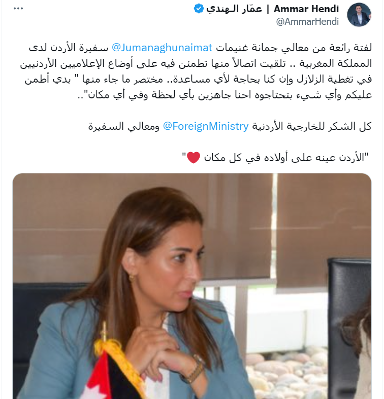 وقال في المنشور: "سفيرة الأردن لدى المملكة المغربية..تلقيت اتصالاً منها تطمئن فيه على أوضاع الإعلاميين الأردنيين في تغطية الزلازل وإن كنا بحاجة لأي مساعدة.. مختصر ما جاء منها " بدي أطمن عليكم وأي شيء بتحتاجوه احنا جاهزين بأي لحظة وفي أي مكان".