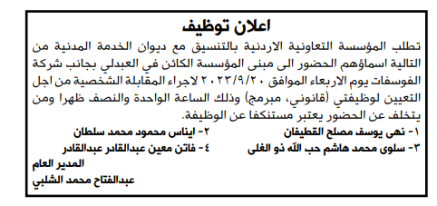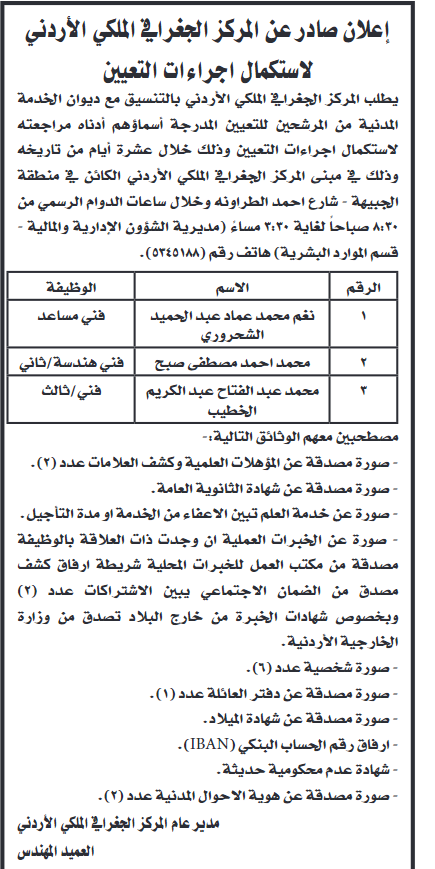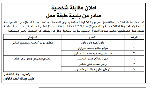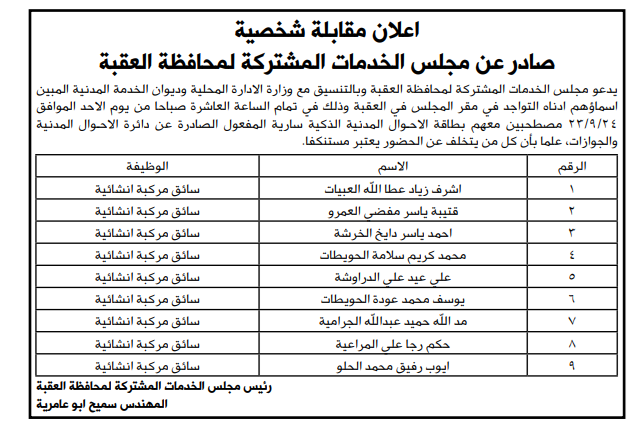 دعا ديوان الخدمة المدنية بالتنسيق مع عدد من الوزارات والمؤسسات الحكومية الأشخاص التالية لإجراء المقابلات الشخصية ولاستكمال إجراءات التعيين.