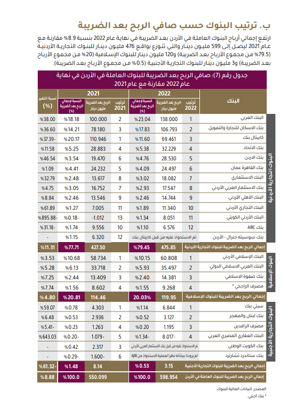 وارتفـع إجمالـي أربـاح البنـوك العاملـة فـي الأردن بعـد الضريبـة فـي نهايـة عـام 2022 بنسـبة 8.9% مقارنـة مـع