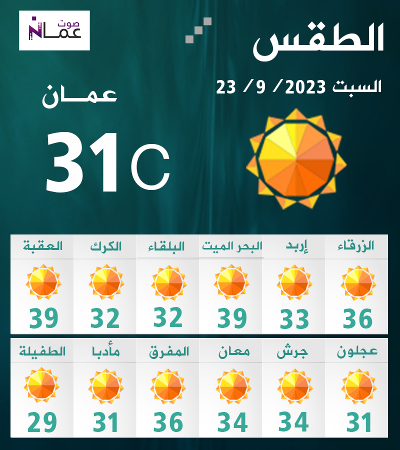 وتبقى الأجواء يوم الاثنين خريفية معتدلة في معظم المناطق، وحارة نسبياً إلى حارة في البادية والأغوار والبحر الميت والعقبة، والرياح شمالية غربية معتدلة السرعة تنشط أحياناً في مناطق البادية.