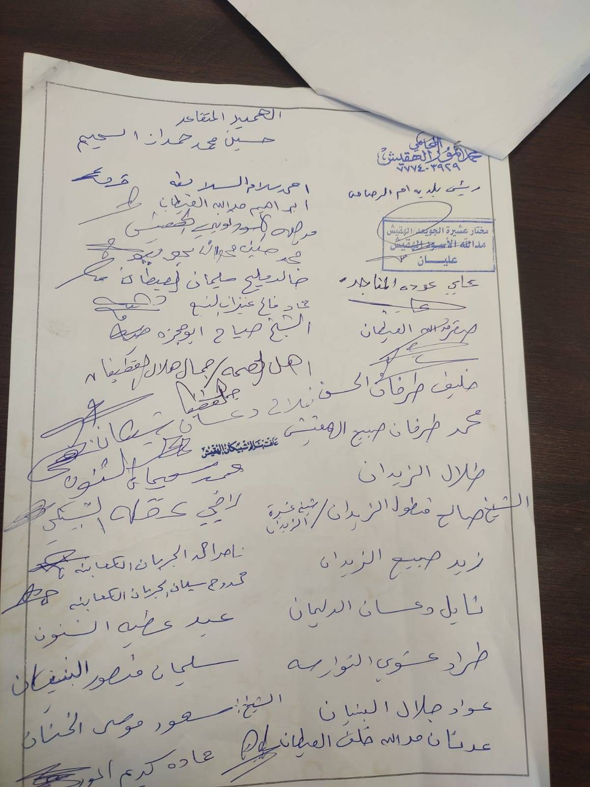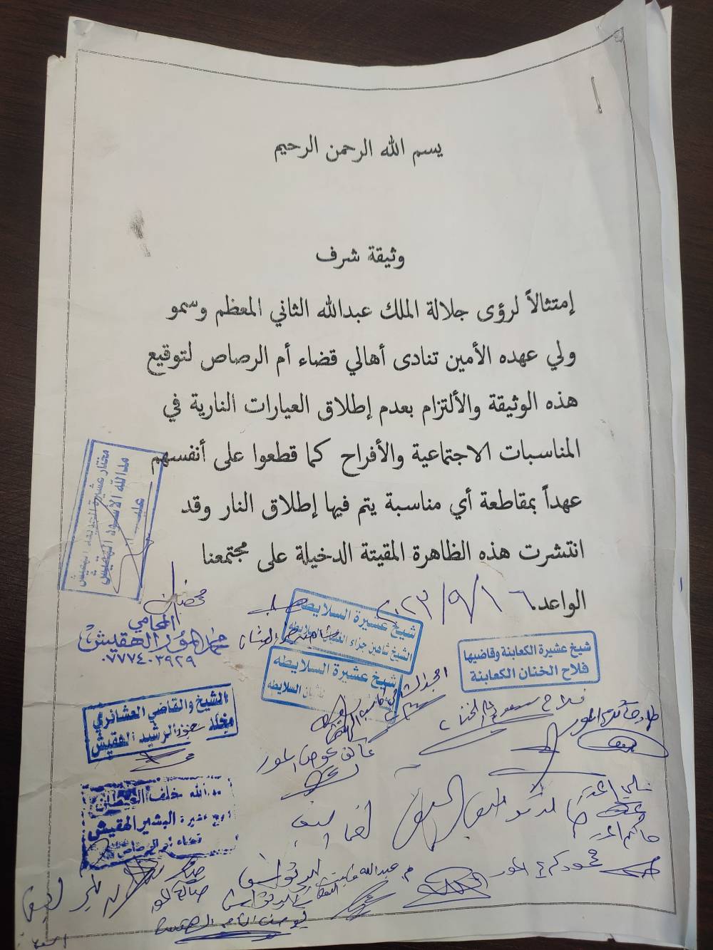 وثيقة شرف في قضاء أم الرصاص نبذا لإطلاق العيارات النارية
