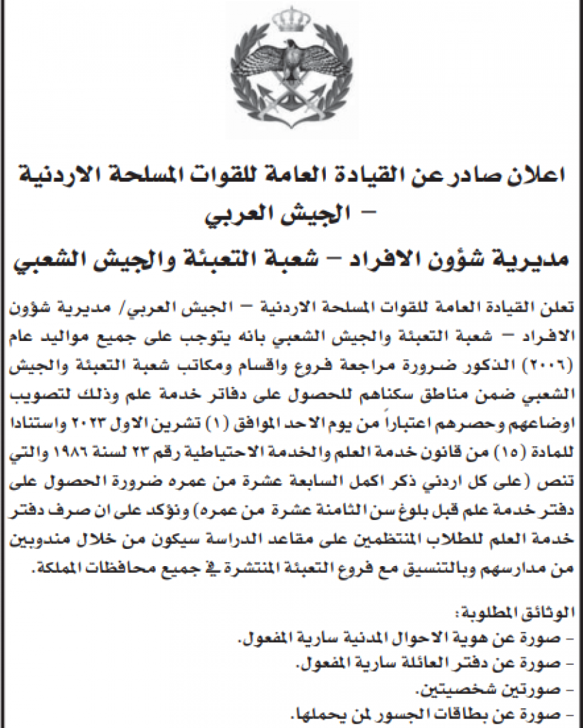 أعلنت القيادة العامة للقوات المسلحة الأردنية - الجيش العربي / مديرية شؤون الافراد - دائرة التعبئة والجيش الشعبي جميع "المواليد عــام 2006 الذكور" إلى مراجعة فروع وأقسام ومكاتب شعبة التعبئة والجيش الشعبي ضمن مناطق سكناهم للحصول على دفاتر خدمة علم.