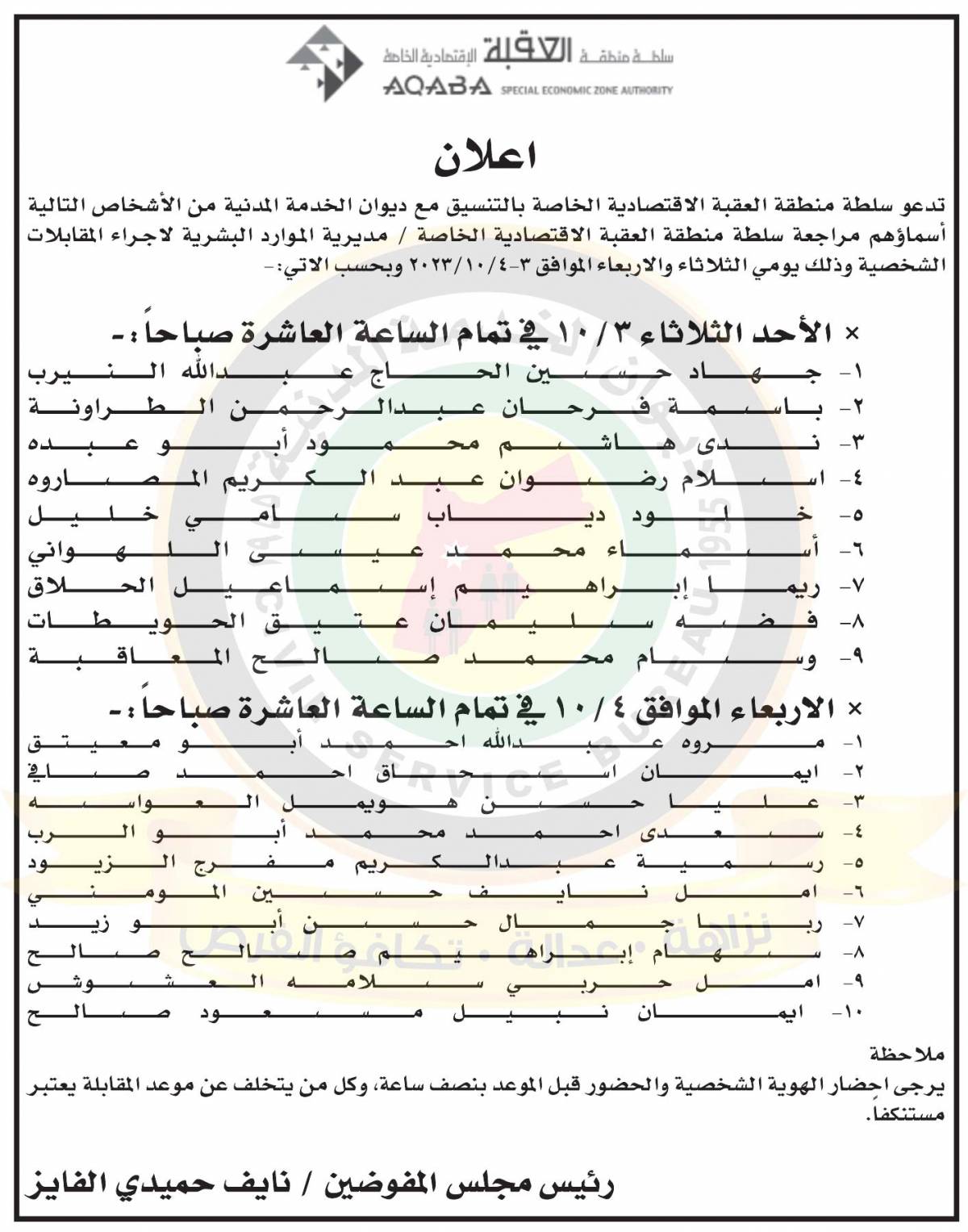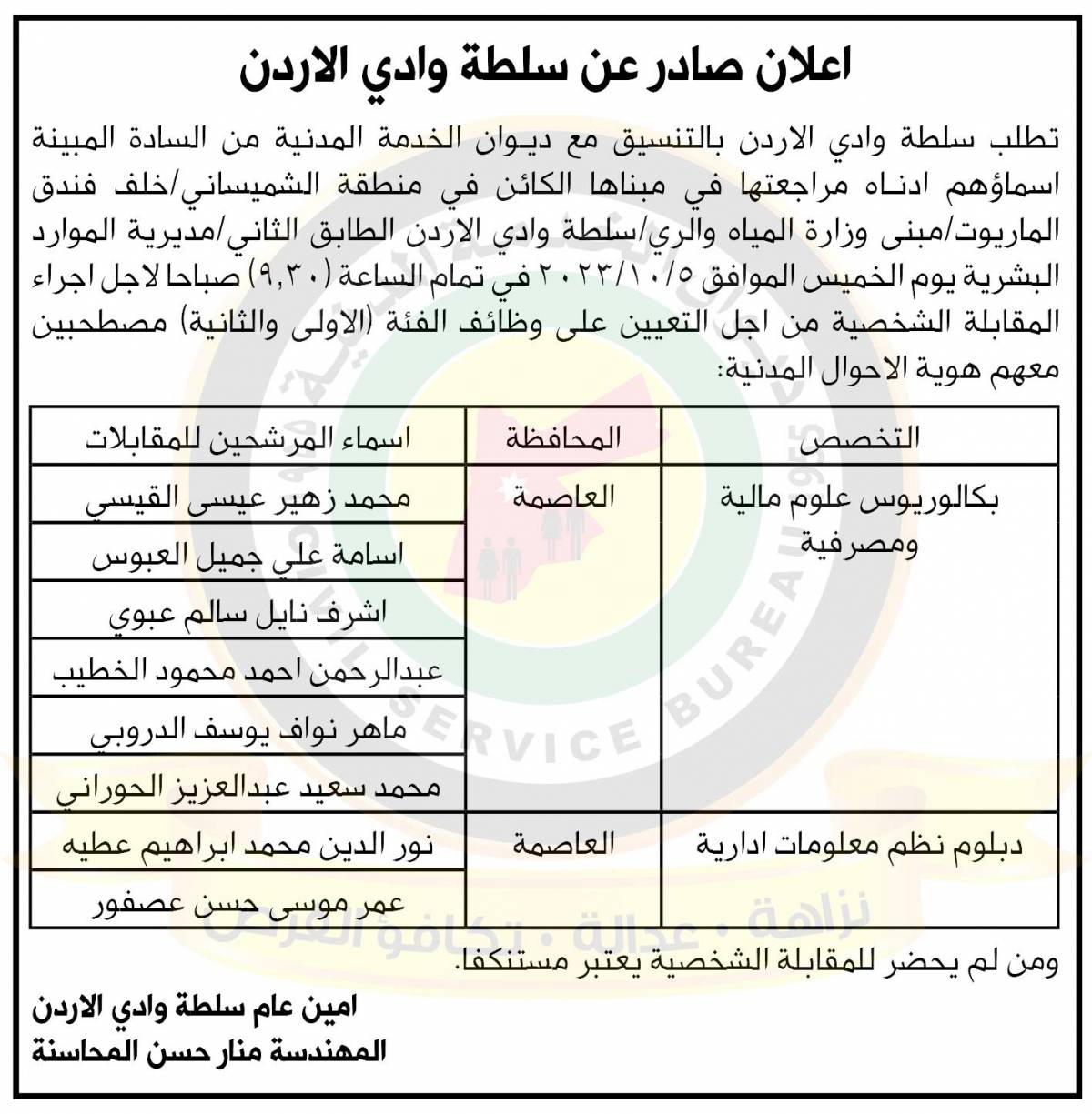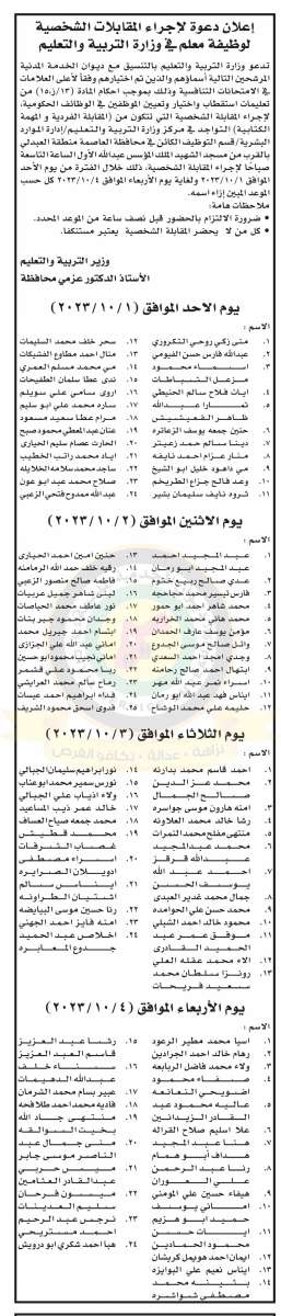وجه ديوان الخدمة المدنية دعوة بالتعاون مع وزارة التربية ومختلف الوزارات والمؤسسات الحكومية، للتالية أسماؤهم، وذلك لإجراء المقابلات الشخصية وعقد الامتحان التنافسي لغايات التعيين.