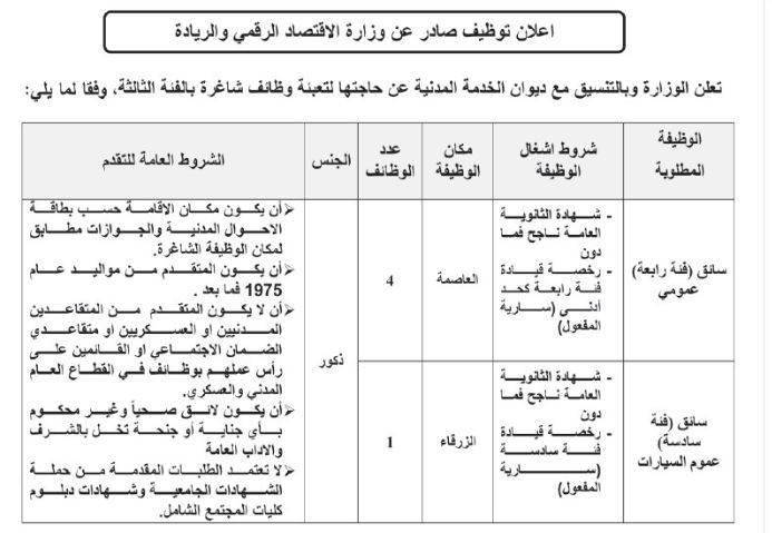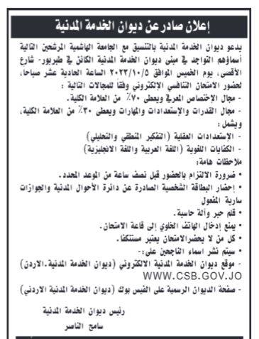 أعلنت عدداً من الوزارات والمؤسسات الحكومية والبلديات، اليوم الأحد، بالتنسيق مع ديوان الخدمة المدنية، عن حاجتهم لتعبئة وظائف شاغرة.
