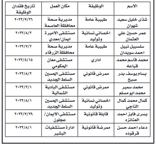 أعلنت وزارة الصحة، اليوم الاثنين، عن فقدان موظفين لوظائفهم، وذلك نظرا لتغيبهم عن مواقع عملهم لمدة تزيد على 10 أيام متصلة أو متقطعة.