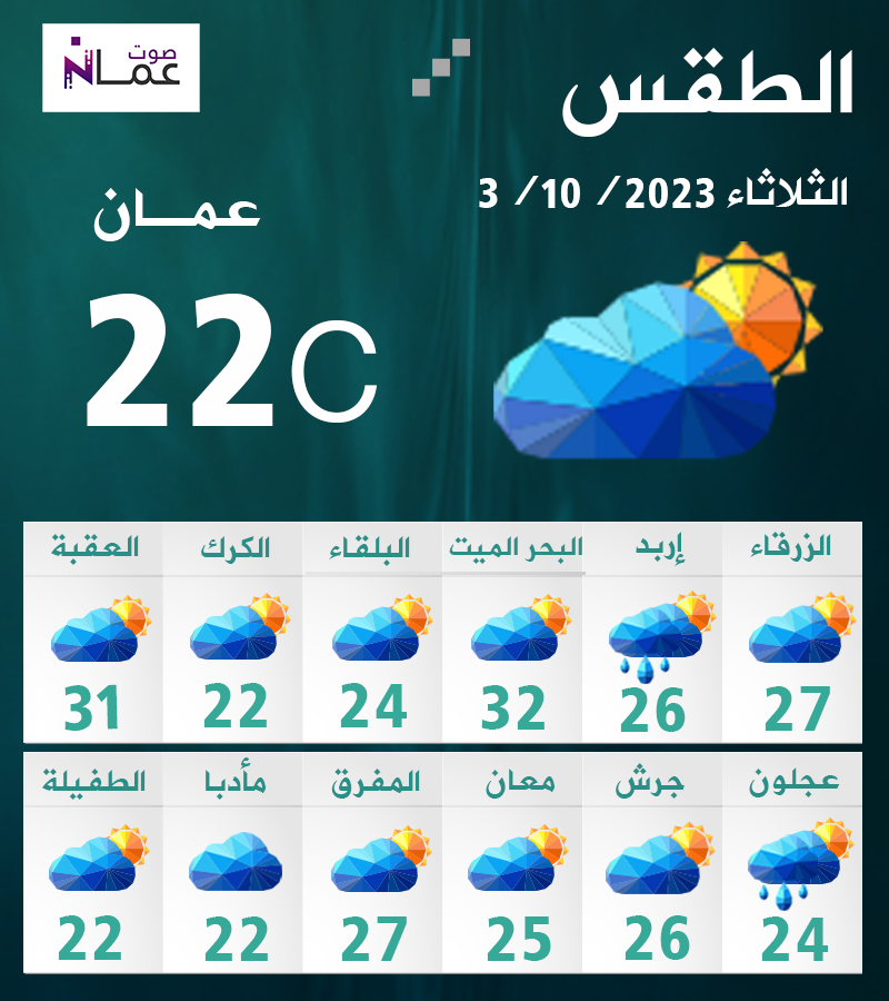 ويطرأ ارتفاع قليل في درجات الحرارة، وتكون الأجواء خريفية معتدلة الحرارة في أغلب مناطق الأردن، و حارة نسبياً في البادية والأغوار والبحر الميت والعقبة، مع ظهور الغيوم على ارتفاعات مختلفة، والرياح شمالية شرقية الى شمالية غربية معتدلة السرعة.