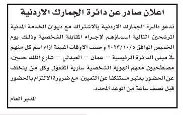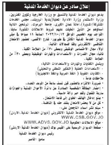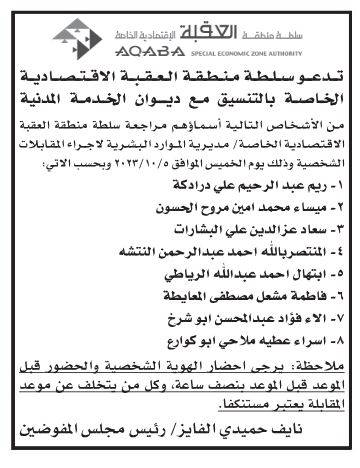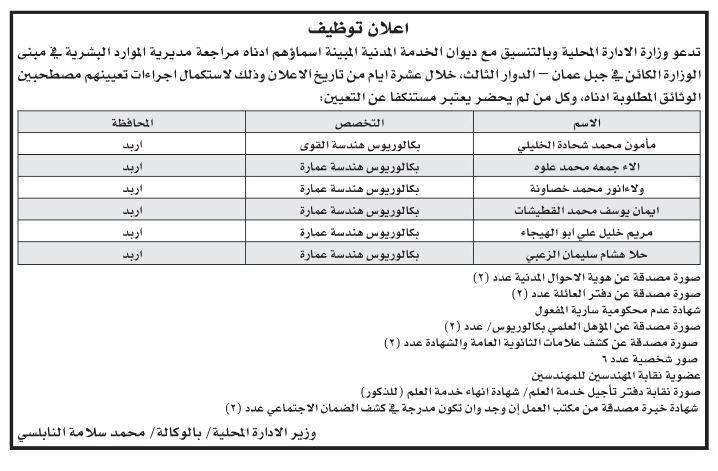 دعا ديوان الخدمة المدنية وبالتعاون مع عددا من الوزارات والمؤسسات الرسمية والبلديات اليوم الثلاثاء، مرشحين لإجراء المقابلات الشخصية واستكمال إجراءات التعيين.