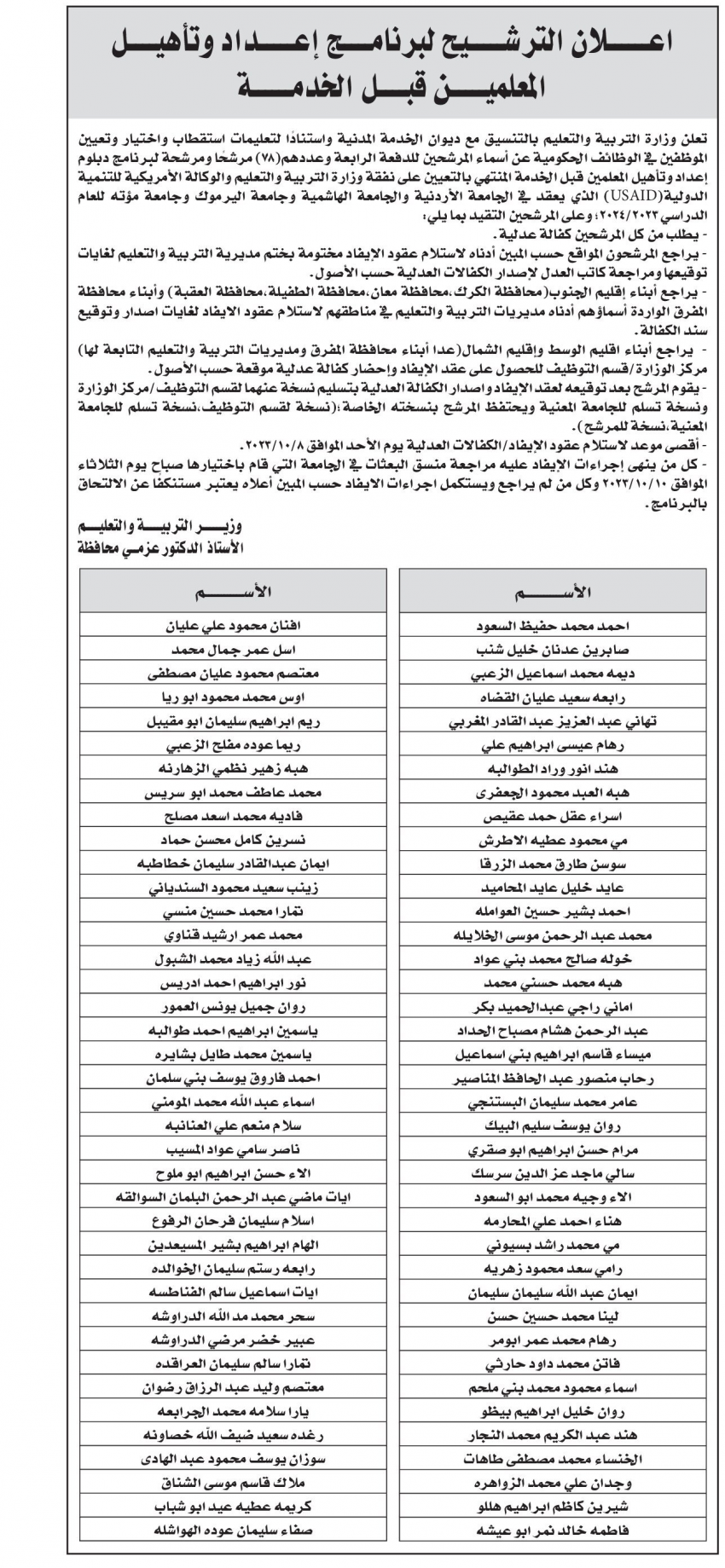 أعلنت وزارة التربية والتعليم اليوم الأربعاء، وبالتنسيق مع ديوان الخدمة المدنية، عن دفعة جديدة من المرشحين لبرنامج إعداد وتأهيل المعلمين قبل الخدمة.