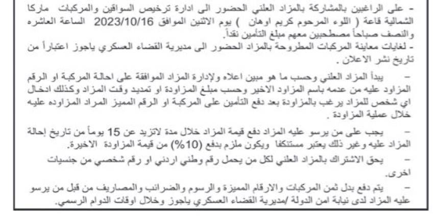 وبينت أنه على الراغبين بالمشاركة بالمزاد العلني الحضور إلى إدارة ترخيص السواقين والمركبات ماركا الشمالية قاعة (اللواء المرحوم كريم أوهان) يوم الإثنين الموافق 16 / 10 / 2023 الساعة 10:30 صباحاً مصطحبين معهم مبلغ التأمين نقداً.