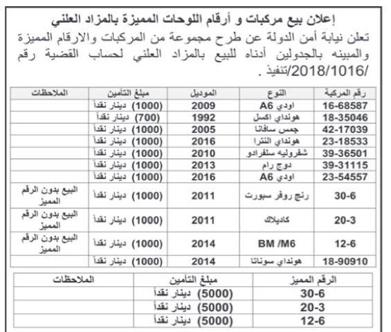الأردن.. مركبات وأرقام مميزة للبيع بالمزاد العلني