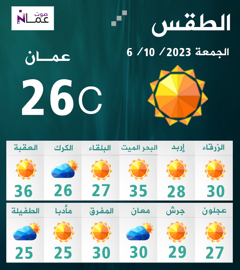 تكون الأجواء اليوم الجمعة، خريفية معتدلة الحرارة في أغلب مناطق الأردن، وحارة نسبياً في الأغوار والبحر الميت والعقبة مع ظهور الغيوم على ارتفاعات متوسطة وعالية، والرياح شمالية غربية معتدلة السرعة تنشط على فترات مثيرة للغبار في شرق المملكة.