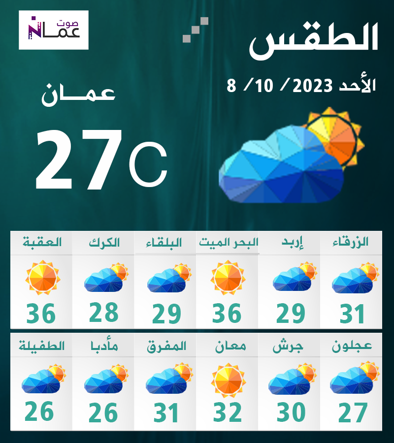 يطرأ ارتفاع قليل في درجات الحرارة اليوم الأحد، مع استمرار الأجواء خريفية معتدلة في أغلب مناطق الأردن، وحارة نسبياً في الأغوار والبحر الميت والعقبة، يرافقها ظهور للغيوم على ارتفاعات متوسطة وعالية، والرياح شمالية غربية إلى شمالية شرقية معتدلة السرعة.