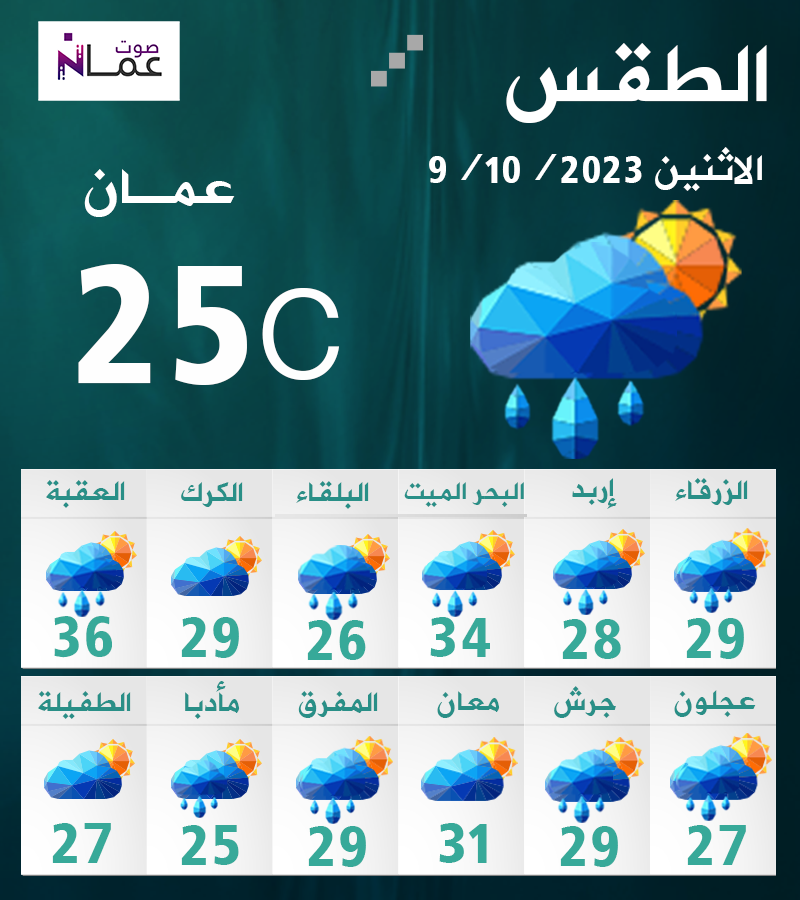 يطرأ انخفاض قليل في درجات الحرارة اليوم الاثنين، وتكون الأجواء خريفية معتدلة في أغلب المناطق، وحارة نسبياً في الأغوار والبحر الميت والعقبة مع ظهوركميات من الغيوم على ارتفاعات متوسطة وعالية.