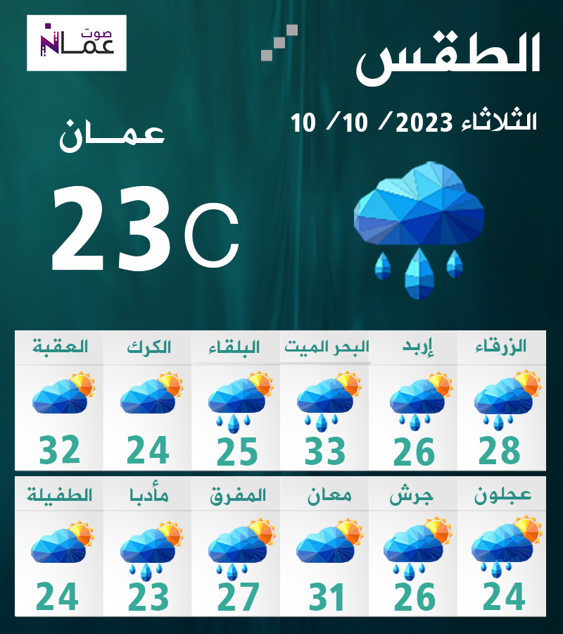 وتبقى الأجواء خريفية معتدلة الحرارة في معظم المناطق يوم الخميس، وحارة نسبياً في الاغوار والبحر الميت والعقبة، مع ظهور بعض الغيوم على ارتفاعات منخفضة، والرياح شمالية غربية معتدلة السرعة.