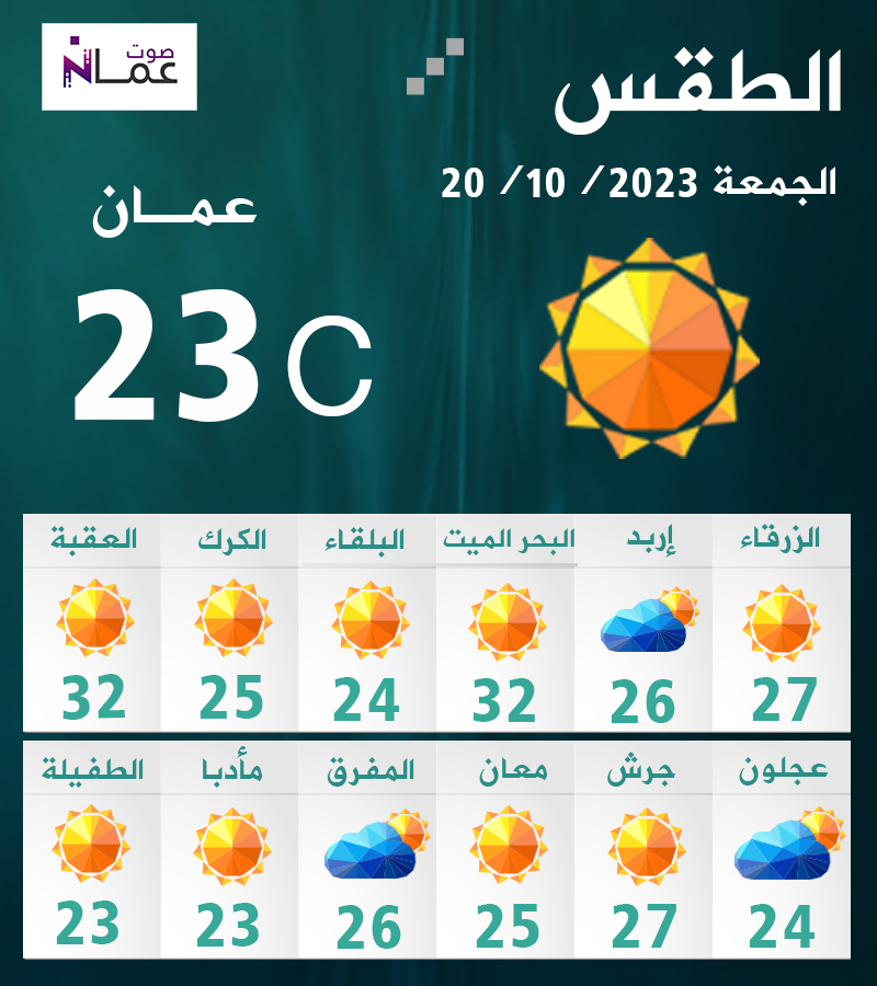 ويطرأ ارتفاع قليل آخر في درجات الحرارة يوم السبت، وتكون الأجواء معتدلة الحرارة في أغلب المناطق، وحارة نسبياً في الأغوار والبحر الميت والعقبة مع ظهور بعض الغيوم على ارتفاعات عالية، والرياح جنوبية شرقية معتدلة السرعة.