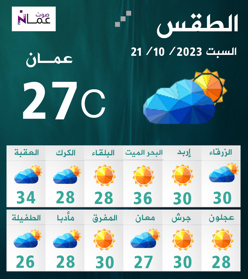 يطرأ ارتفاع طفيف في درجات الحرارة اليوم السبت، وتكون الأجواء معتدلة الحرارة في أغلب مناطق الأردن، وحارة نسبياً في الأغوار والبحر الميت والعقبة ظهور بعض الغيوم على ارتفاعات عالية، والرياح شرقية معتدلة السرعة.