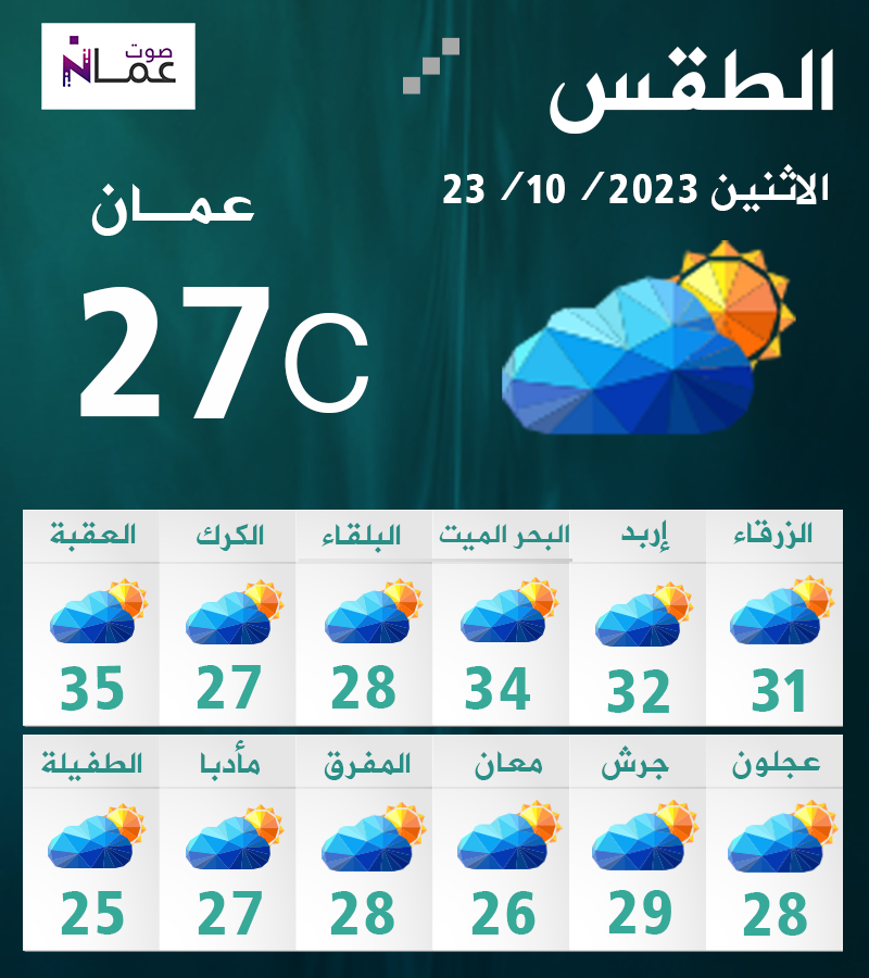 تبقى الأجواء اليوم الاثنين معتدلة الحرارة في أغلب مناطق الأردن، وحارة نسبياً في الأغوار والبحر الميت والعقبة، مع ظهورالغيوم على ارتفاعات متوسطة خاصة في جنوب وشرق المملكة.