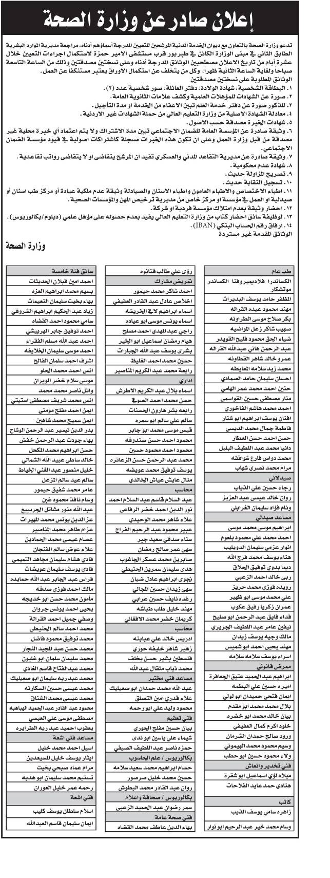 أعلنت وزارة الصحة بالتنسيق مع ديوان الخدمة المدنية دعوة المدرجة أسماؤهم أدناه لمراجعة مديرية الموارد البشرية في مبنى الوزارة لاستكمال إجراءات التعيين.