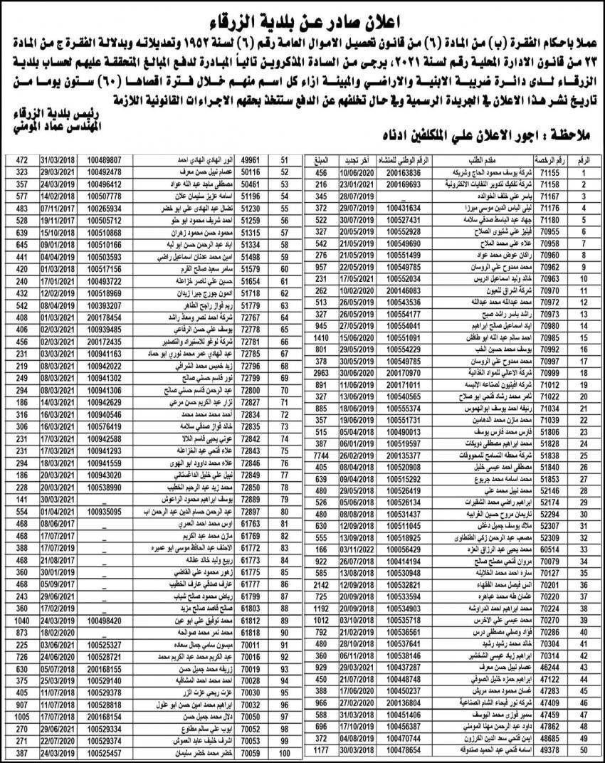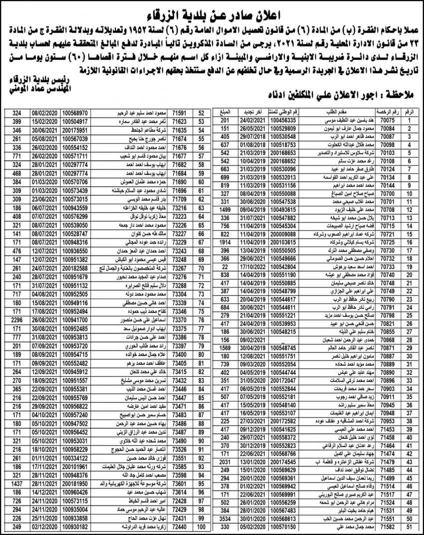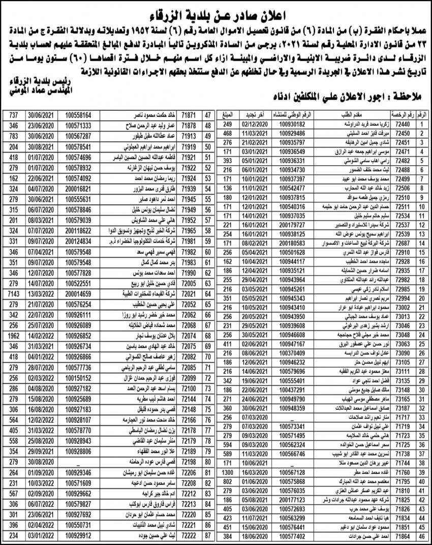 نشرت بلدية الزرقاء دفعة من اسماء الأشخاص المتخلفين عن دفع الضرائب المترتبة عليهم لصالح البلدية.