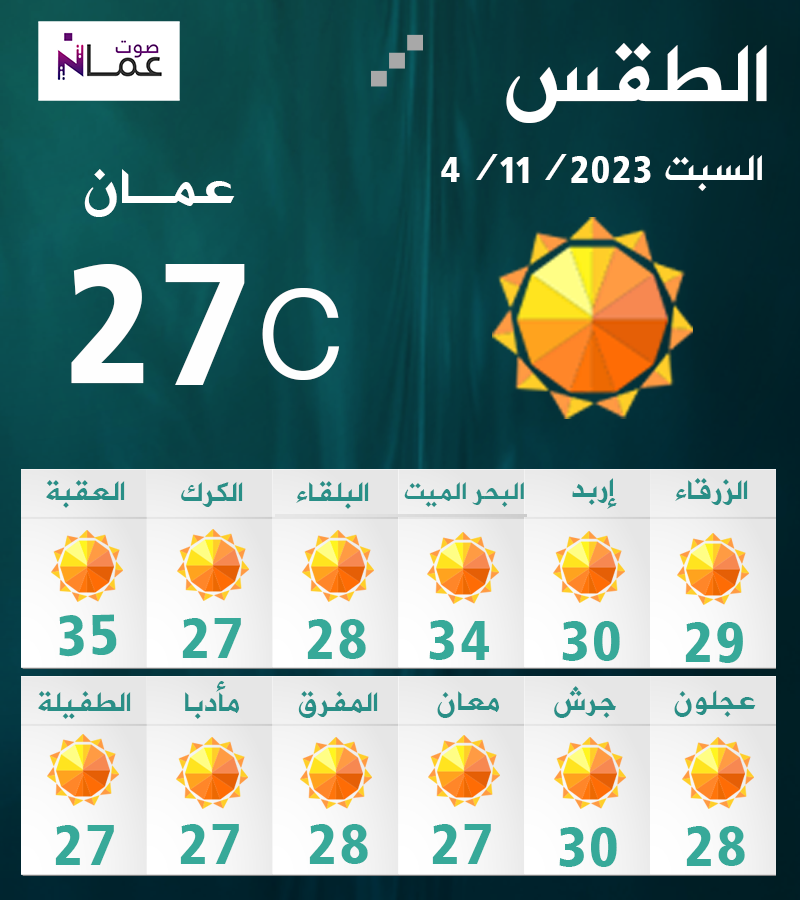 يطرأ ارتفاع طفيف في درجات الحرارة اليوم السبت، وتكون الأجواء معتدلة الحرارة في أغلب مناطق الأردن، وحارة نسبيا في الأغوار والبحر الميت والعقبة، مع ظهور الغيوم على ارتفاعات متوسطة في جنوب المملكة، والرياح جنوبية شرقية معتدلة السرعة.
