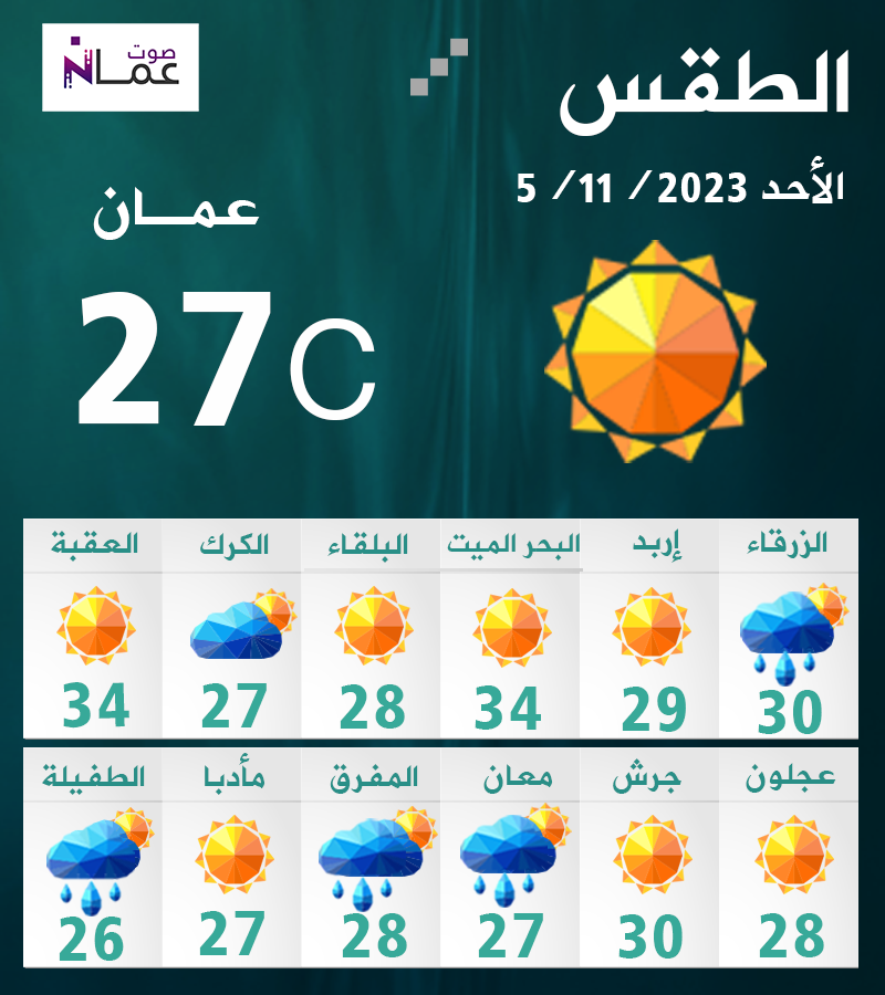 تكون الأجواء معتدلة الحرارة في أغلب مناطق الأردن اليوم الأحد، وحارة نسبياً في الأغوار والبحر الميت والعقبة.
