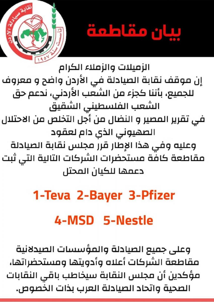 دعت نقابة الصيادلة الأردن عموم الصيادلة والمؤسسات الصيدلانية في المملكة إلى مقاطعة عدد من الشركات وأدويتها ومستحضراتها، التي ثبت دعمها للكيان الصهيوني.