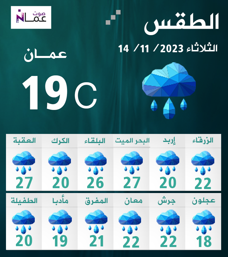 وتهطل باذن الله الأمطار بين الحين والآخر في شمال ووسط الأردن، وتمتد إلى أجزاء من المناطق الجنوبية والشرقية، قد تكون غزيرة لفترات محدودة خاصة في شمال ووسط المملكة بما فيها منطقة البحر الميت يصحبها الرعد وتساقط حبات البرد وتدريجيا مع ساعات الليل تضعف شدة هطول الأمطار، والرياح شمالية غربية معتدلة السرعة تنشط على فترات.