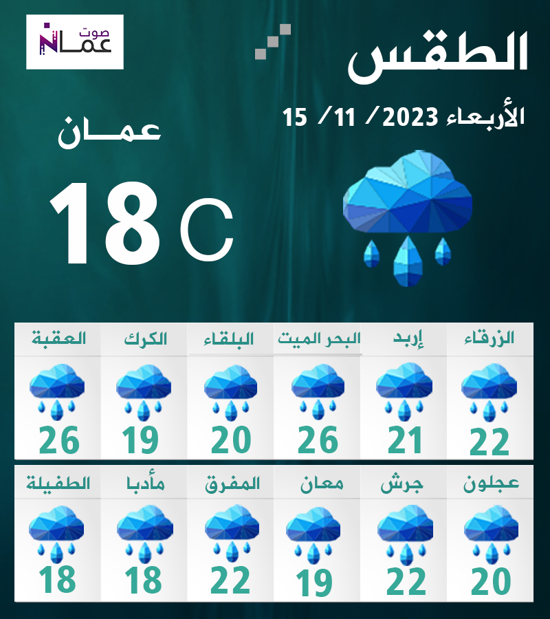 يوم الخميس، يطرأ ارتفاع طفيف في درجات الحرارة، وتكون الأجواء لطيفة في أغلب المناطق، ومعتدلة في الأغوار والبحر الميت والعقبة، مع ظهور بعض الغيوم على ارتفاعات منخفضة، والرياح جنوبية شرقية خفيفة السرعة تتحول الى شمالية غربية معتدلة.
