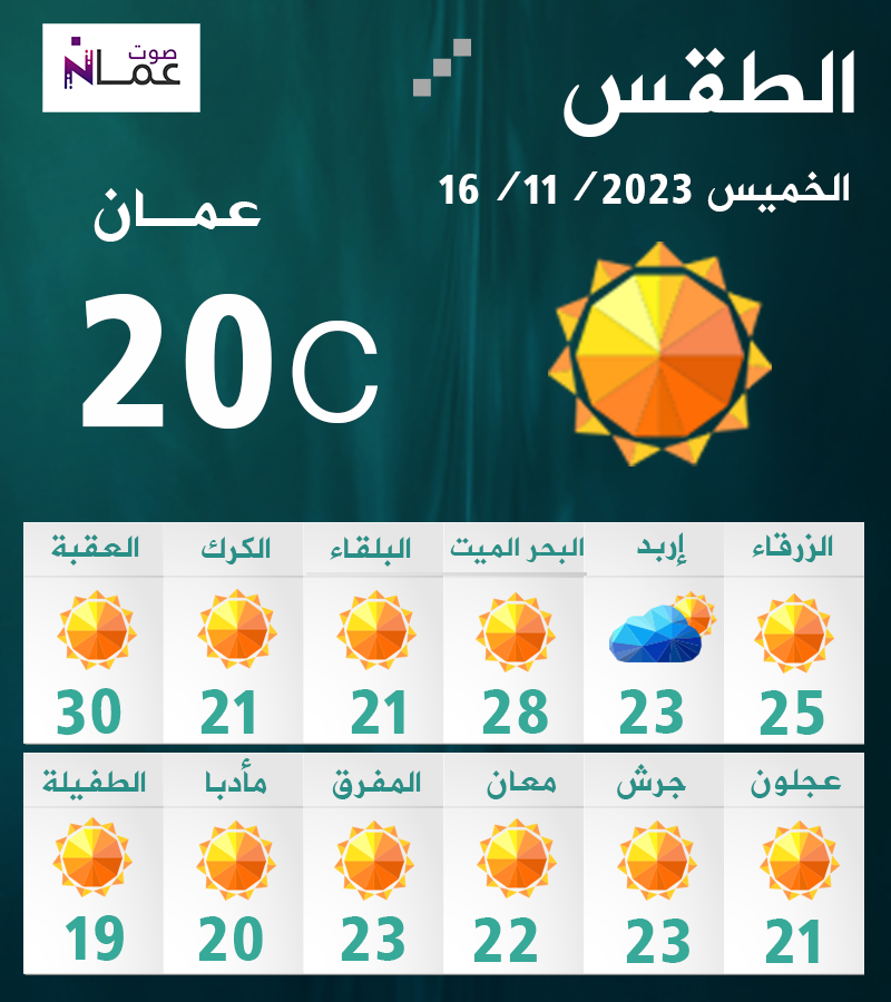 تبقى الأجواء لطيفة في أغلب مناطق الأردن اليوم الخميس، وتكون معتدلة في الأغوار والبحر الميت والعقبة، مع ظهور بعض الغيوم على ارتفاعات منخفضة، والرياح جنوبية شرقية معتدلة السرعة تتحول مساءً إلى شمالية غربية.