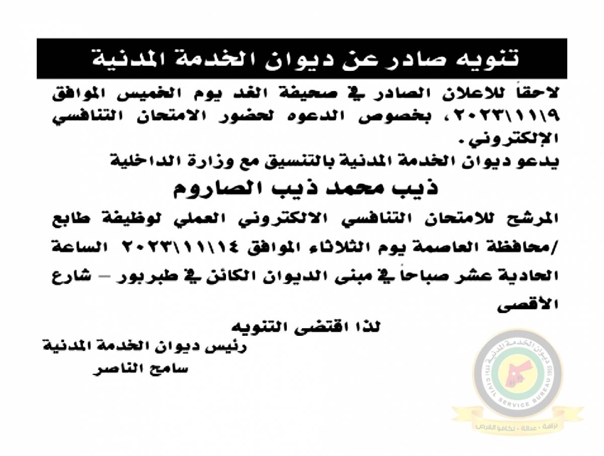 وجه ديوان الخدمة المدنية، دعوة للمرشحين المدرجة أسماؤهم أدناه، لإجراء الامتحان التنافسي الالكتروني في عدة وزارات ومؤسسات حكومية .