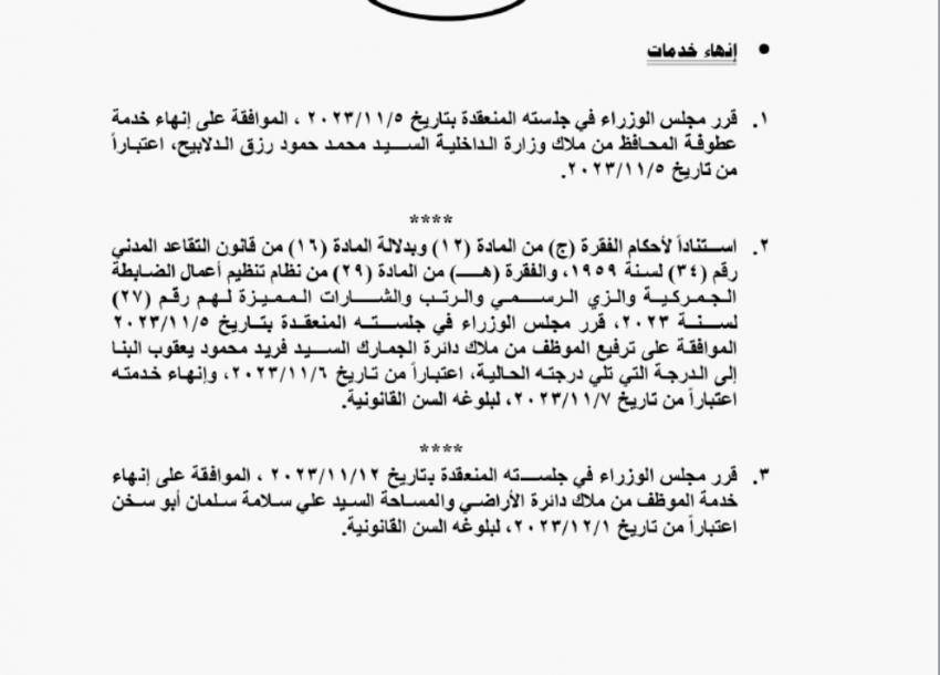 صدر في عدد الجريدة الرسمية اليوم الخميس، قرارات مجلس الوزراء المتضمنة الموافقة على إحالة موظفين حكوميين إلى التقاعد، وإنهاء خدمات آخرين.