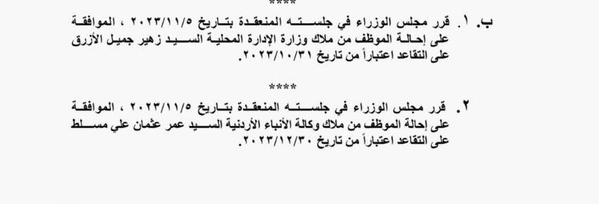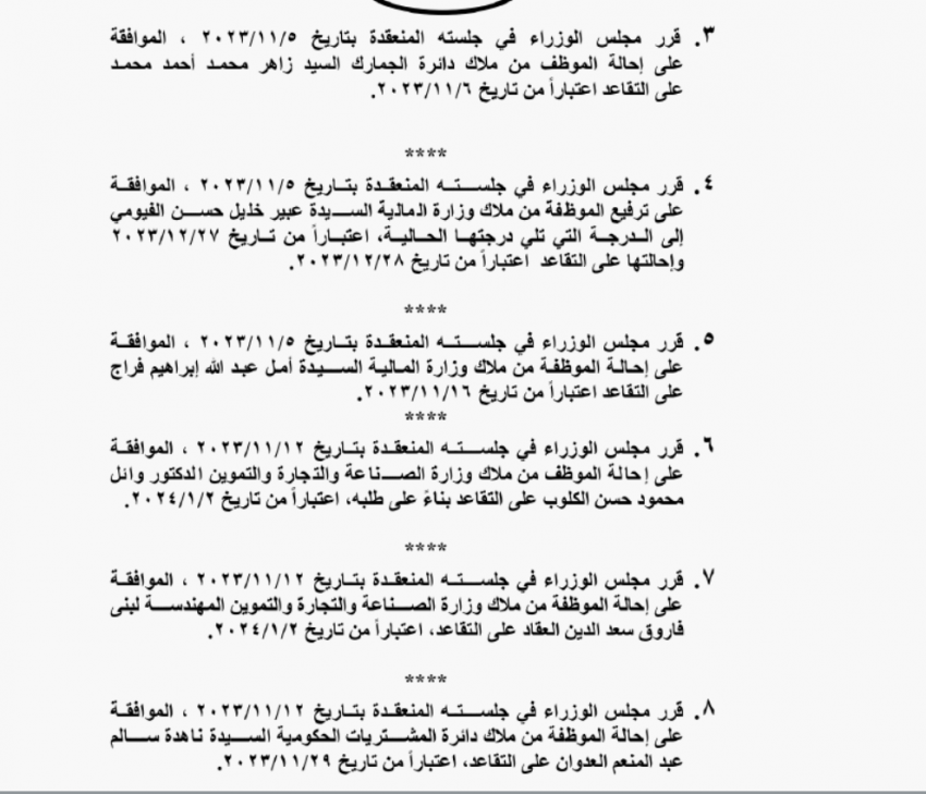صدر في عدد الجريدة الرسمية اليوم الخميس، قرارات مجلس الوزراء باحالة موظفين حكوميين إلى التقاعد، وانهاء خدمات آخرين.