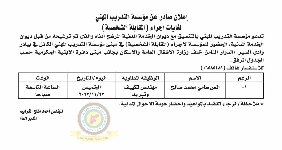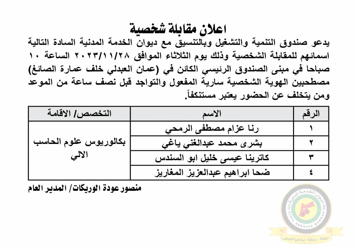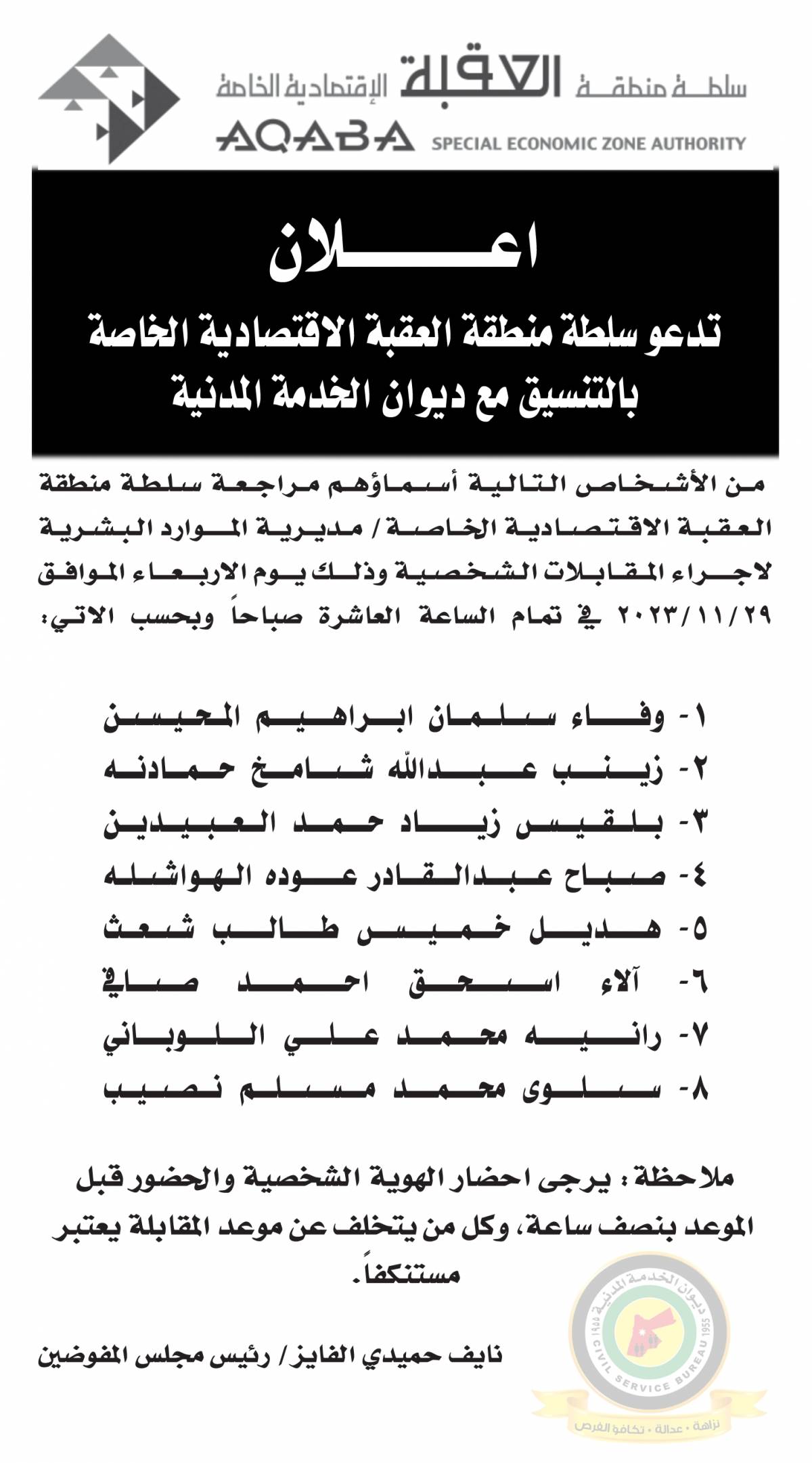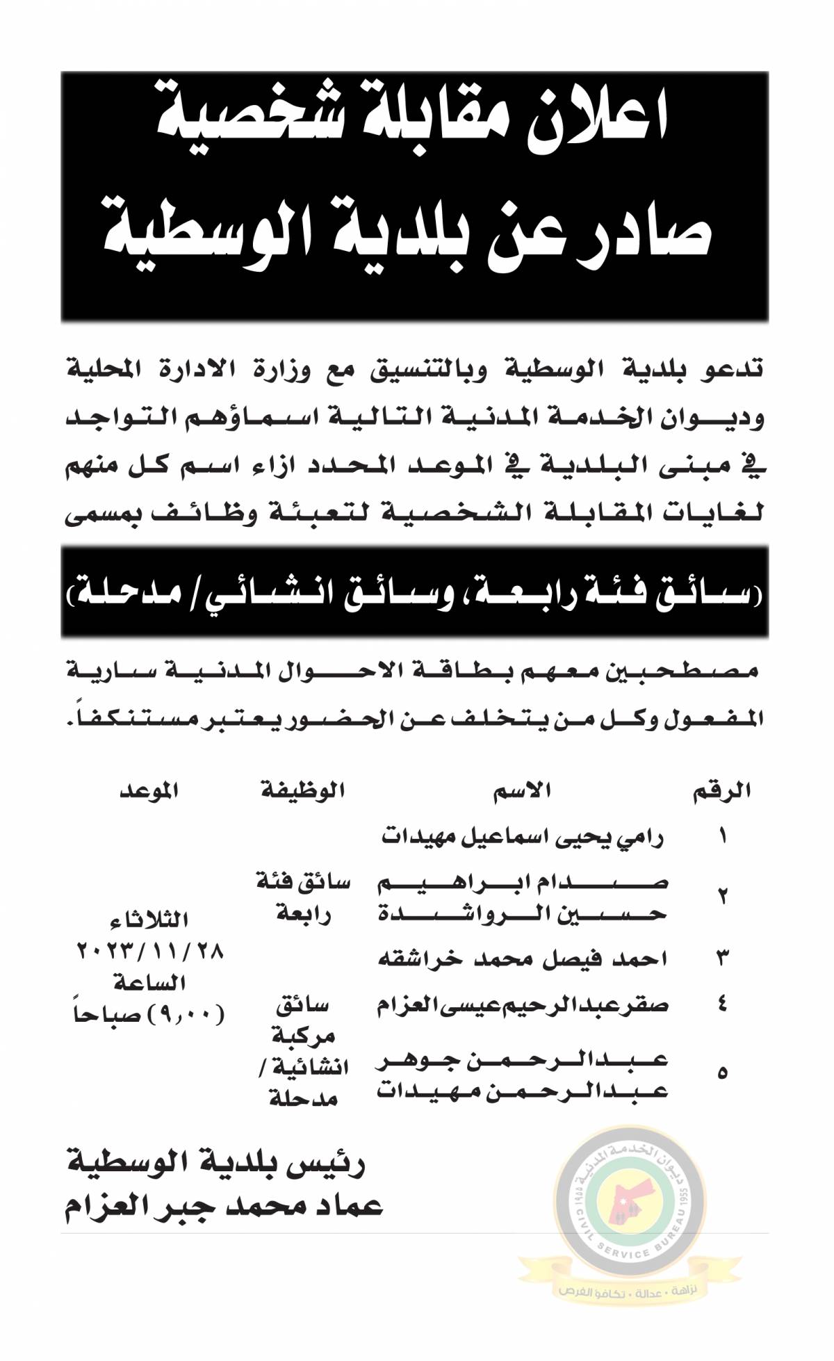 دعت عدد من الوزارات والمؤسسات الرسمية والبلديات بالتنسيق مع ديوان الخدمة المدنية ، مرشحين لإجراء المقابلات الشخصية.