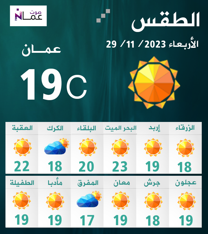 يطرأ ارتفاع في درجات الحرارة اليوم الأربعاء، لتصبح حول معدلاتها العامة لمثل هذا الوقت من السنة،  وتكون الأجواء باردة نسبيا في معظم مناطق الأردن، ومعتدلة الحرارة في الأغوار والبحر الميت والعقبة، مع ظهور الغيوم على ارتفاعات مختلفة، والرياح جنوبية شرقية معتدلة السرعة.