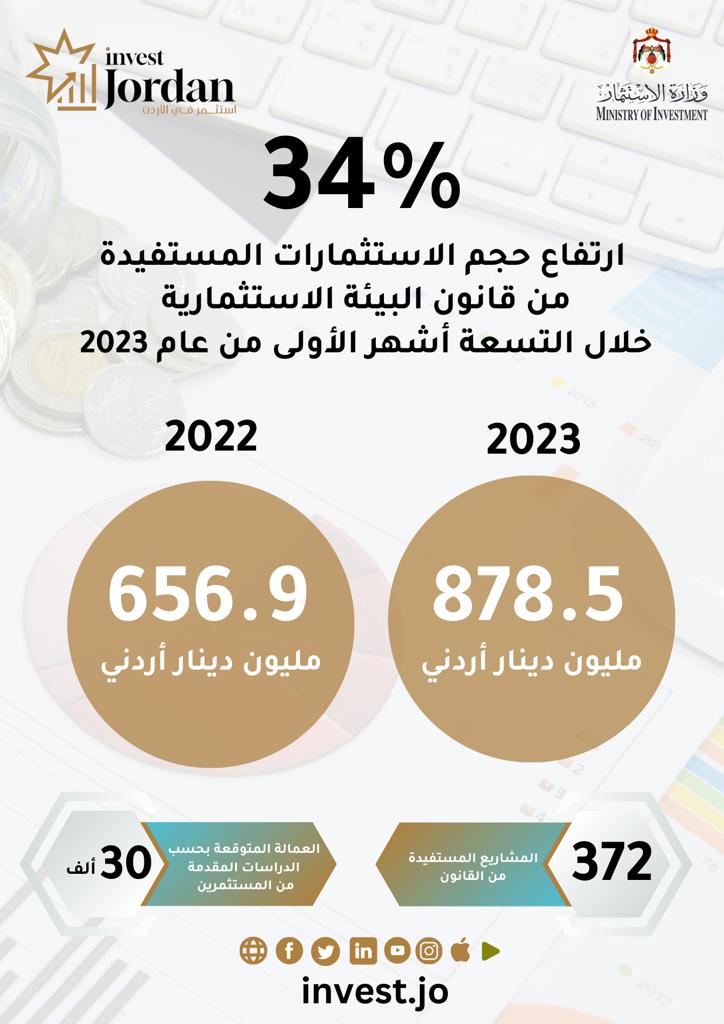 ارتفع حجم الاستثمارات المستفيدة من قانون البيئة الاستثمارية في الأردن خلال التسعة أشهر الاولى من عام 2023 بنسبة 34% ليصل الى 878.5 مليون دينار مقارنة بـ 656.9 مليون دينار خلال ذات الفترة من عام 2022. حيث بلغ عدد المشاريع المستفيدة من القانون 372 مشروع استثماري، وبحجم عمالة متوقعة بحسب الدراسات المقدمة من قبل المستثمرين ستصل الى ما يقارب 30 ألف فرصة عمل.