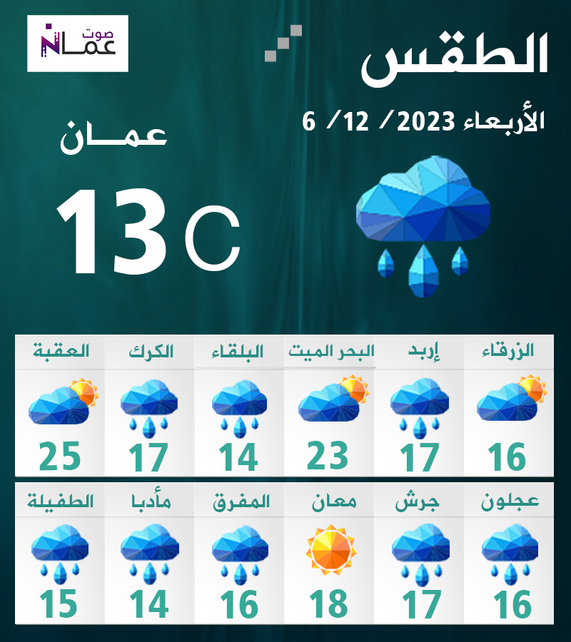 يوم الخميس، تكون الأجواء غائمة جزئياً وباردة نسبياً في معظم المناطق، ومعتدلة في الأغوار والبحر الميت والعقبة، والرياح جنوبية غربية معتدلة السرعة.