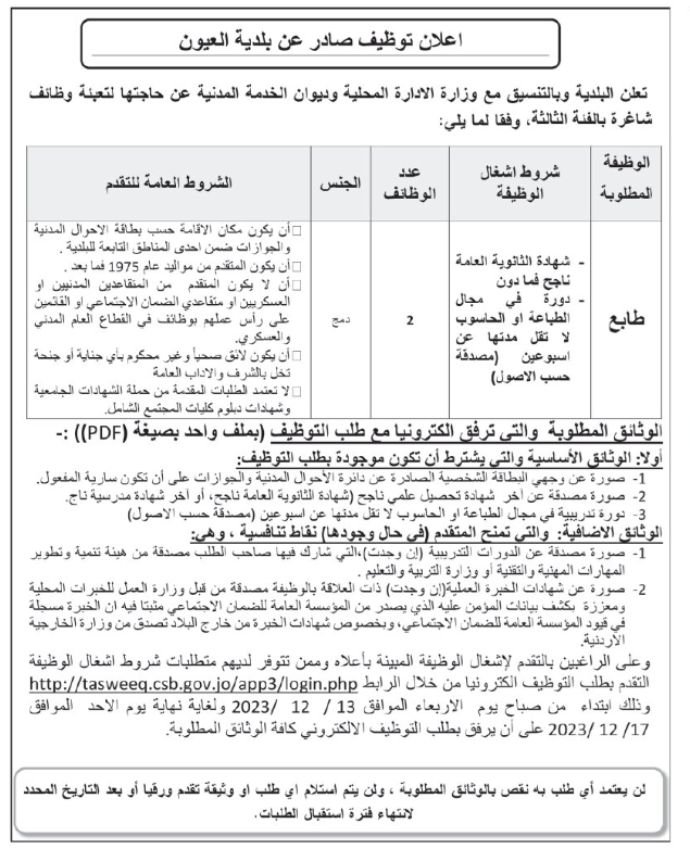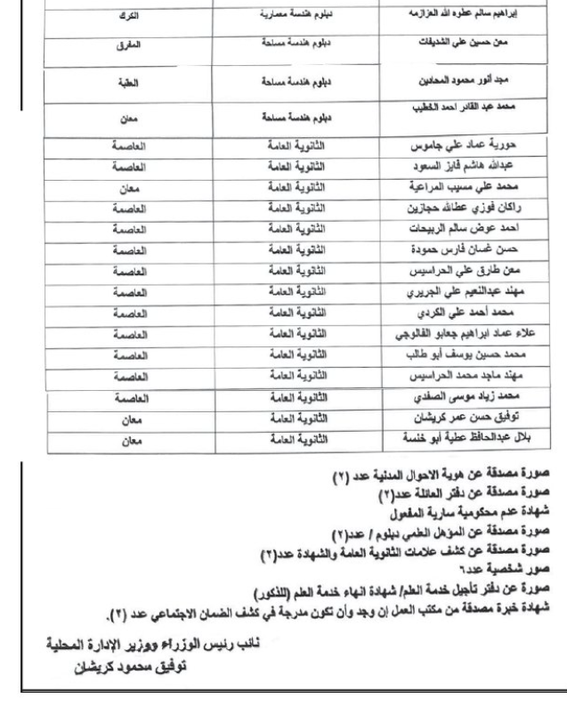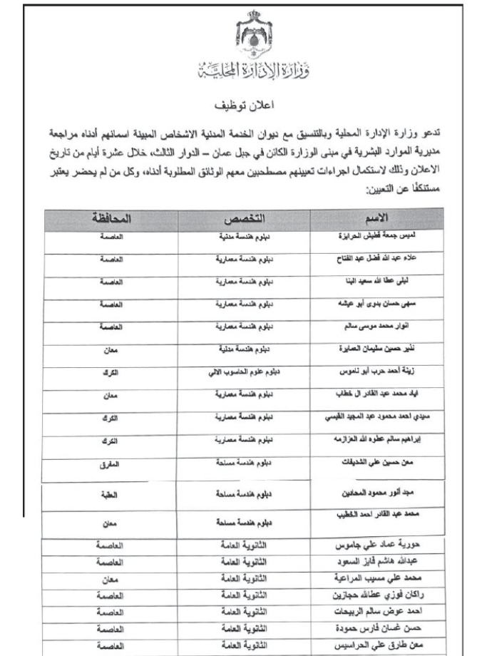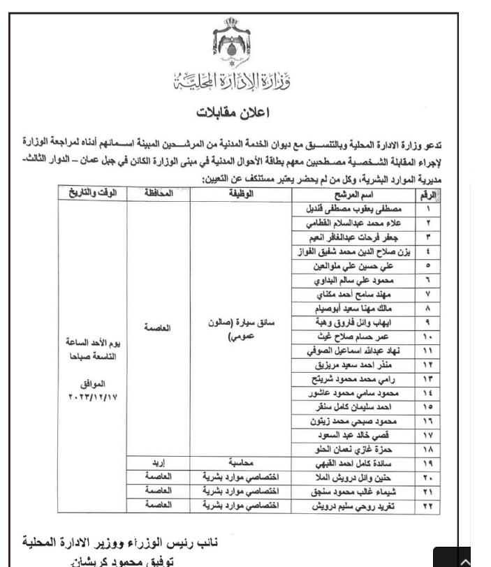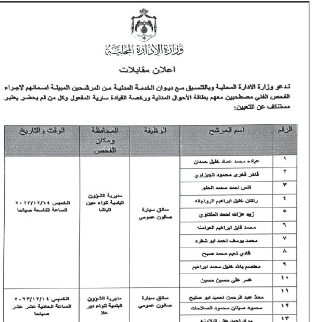 دعا ديوان الخدمة المدنية أشخاص لاستكمال إجراءات التعيين وإجراء المقابلات الشخصية بالتنسيق مع الدوائر المعنية وفقًا للشروط المحددة.