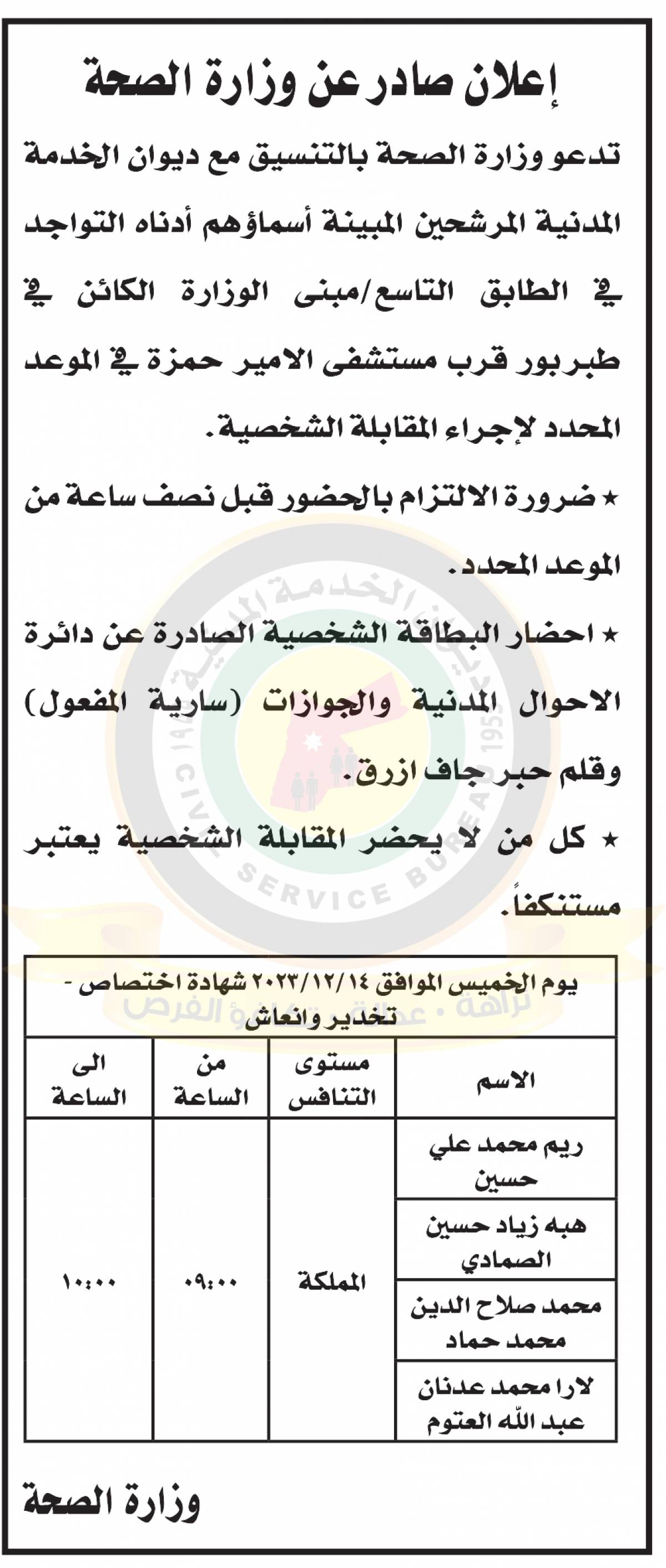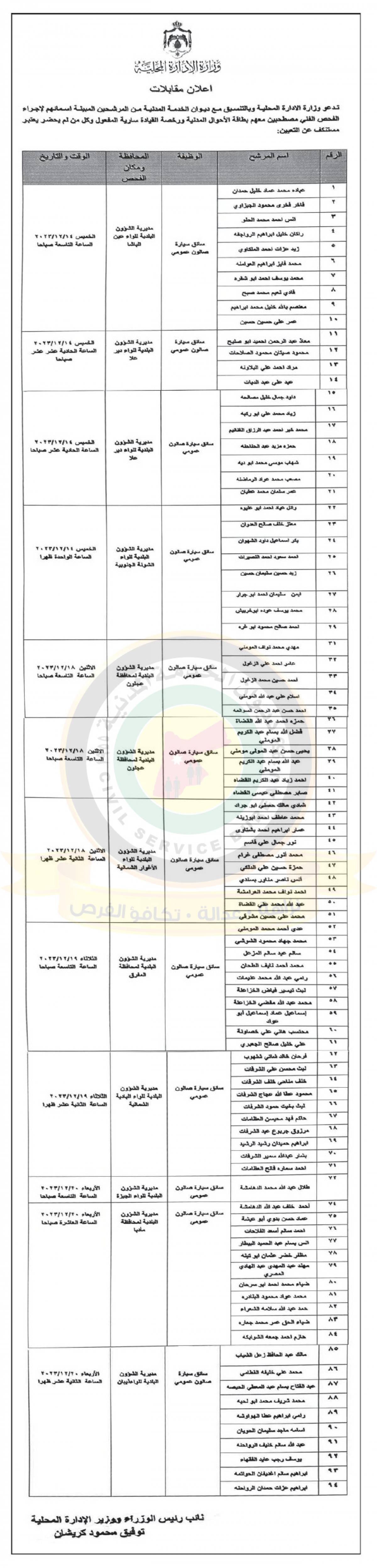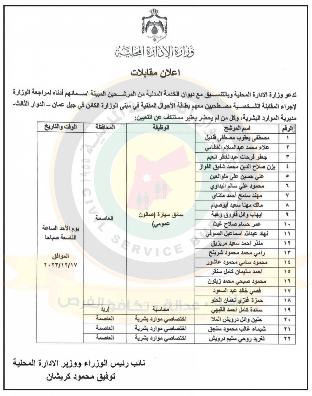 دعا ديوان الخدمة المدنية المرشحين المدرجة أسماؤهم أدناه لإجراء الامتحان التنافسي الالكتروني في عدة وزارات ومؤسسات حكومية .