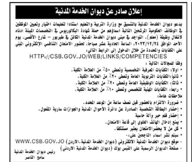 وأشار إلى أنه يجب التواجد في مبنى ديوان الخدمة المدنية الكائن في طبربور شارع الأقصى حسب الأيام والأوقات المبينة أدناه لحضور الامتحان التنافسي الالكتروني المبني على الكفايات المحددة وفقا للمجالات المذكورة.