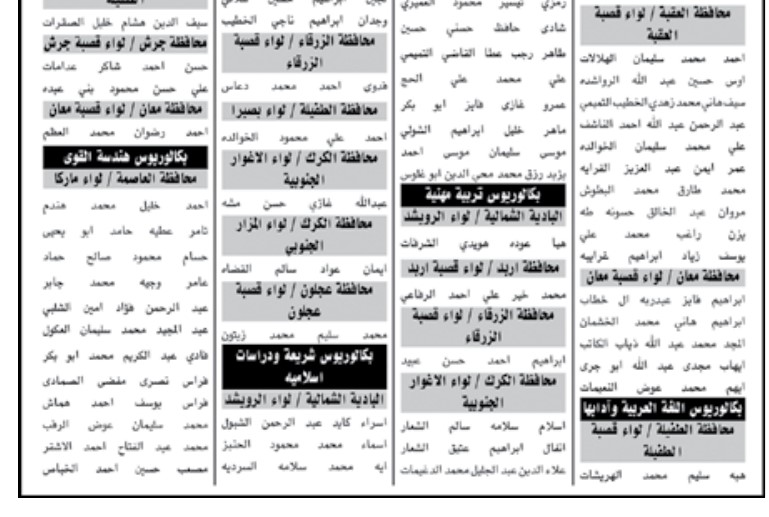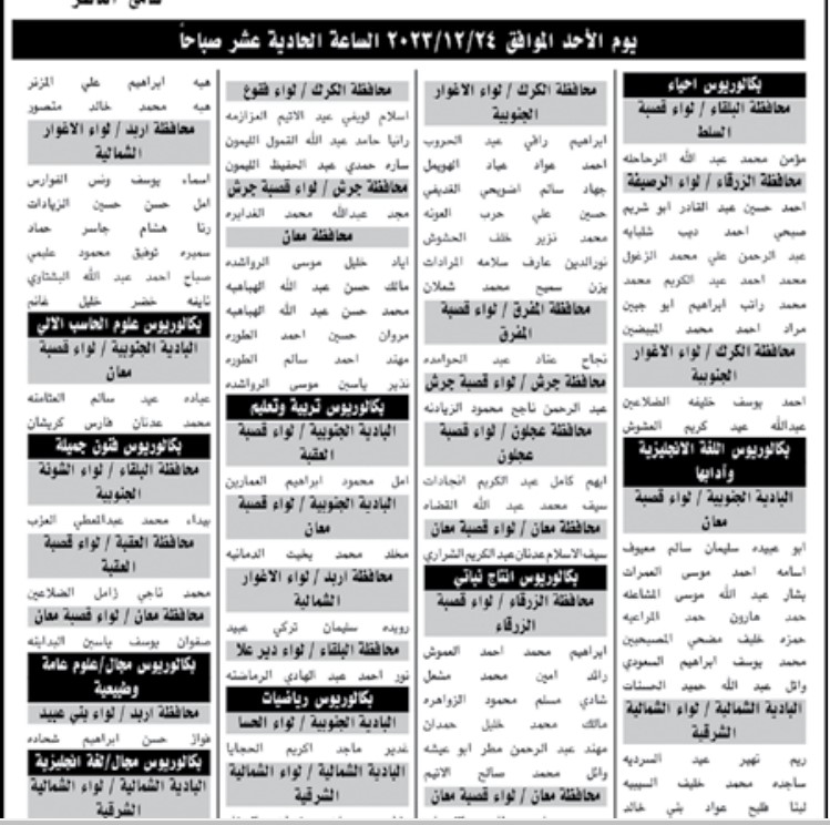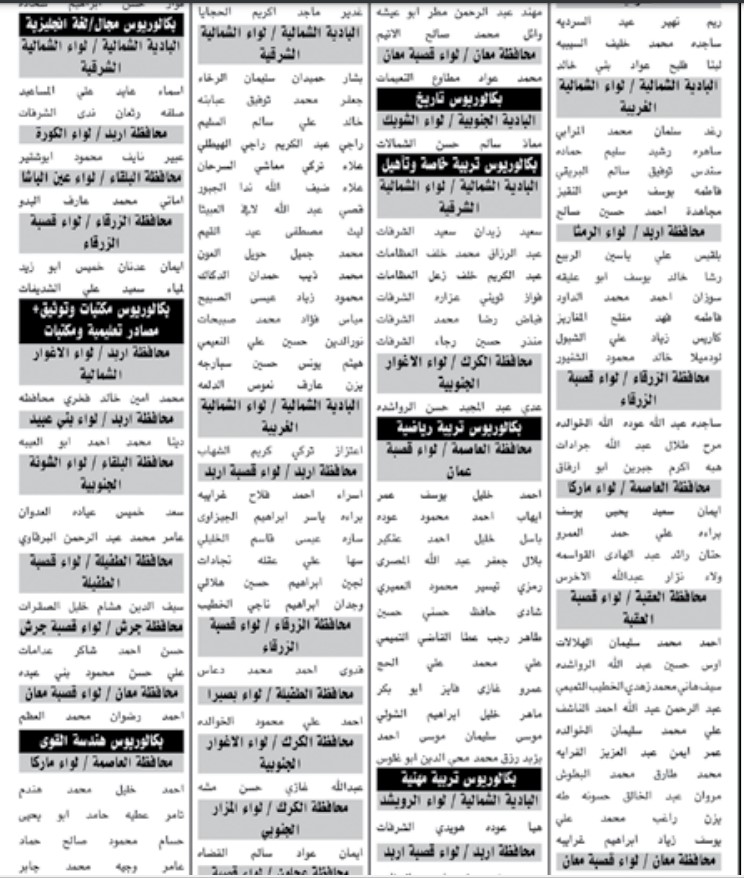 وجه ديوان الخدمة المدنية بالتنسيق مع وزارة التربية والتعليم استنادا لتعليمات اختيار وتعيين الموظفين في الوظائف الحكومية، دعوة للمرشحين التالية أسماؤهم من حملة شهادة البكالوريوس في التخصصات المبية أدناه لاشغال وظيفة معلم.