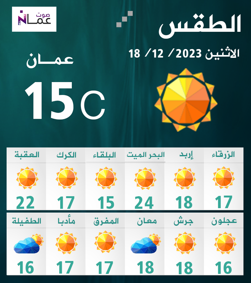 يطرأ انخفاض قليل في درجات الحرارة اليوم الاثنين، وتكون الأجواء باردة نسبياً في أغلب مناطق الأردن، ومعتدلة في الأغوار والبحر الميت والعقبة، مع ظهور بعض الغيوم على ارتفاعات منخفضة في شمال ووسط المملكة، والرياح جنوبية شرقية معتدلة السرعة.
