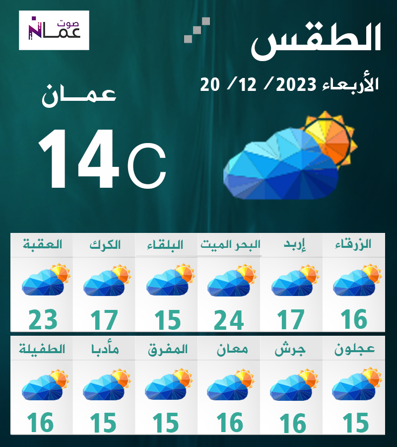 تبقى الأجواء باردة نسبياً في أغلب مناطق الأردن اليوم الأربعاء، وتكون معتدلة الحرارة في الأغوار والبحر الميت والعقبة، مع ظهور الغيوم على ارتفاعات عالية، والرياح جنوبية شرقية معتدلة السرعة تنشط على فترات.
