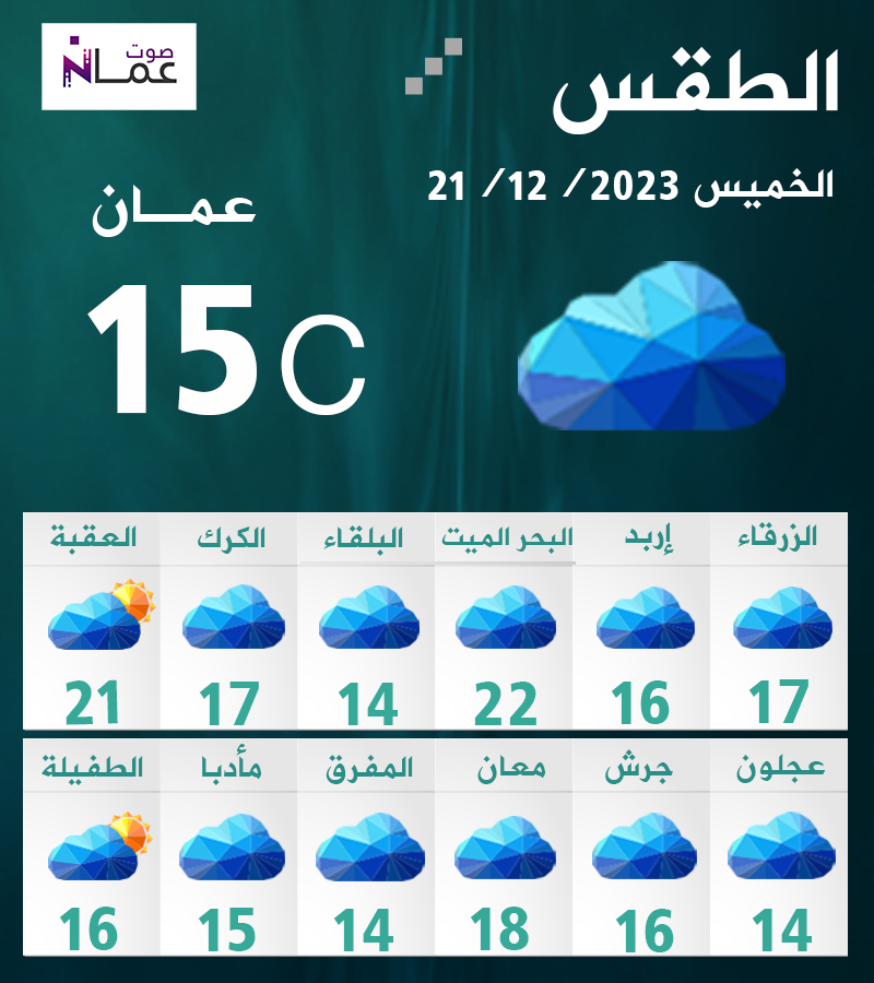 تستمر اليوم الخميس الأجواء الباردة نسبياً في أغلب مناطق الأردن، والمعتدلة في الأغوار والبحر الميت والعقبة، مع ظهور كميات من الغيوم على ارتفاعات عالية، وتسود رياح جنوبية شرقية تتراوح سرعتها مابين (20-30) كم/ساعة.