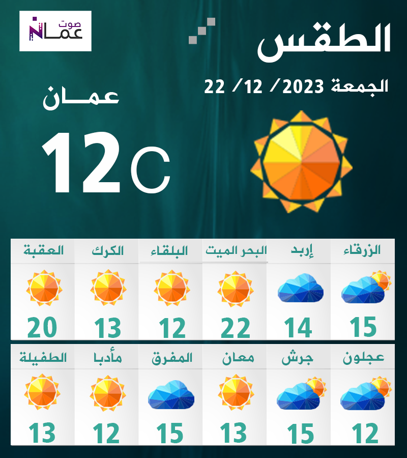 وتبقى الأجواء يوم الأحد باردة في أغلب المناطق ولطيفة الحرارة في الأغوار والبحر الميت والعقبة مع ظهور الغيوم على ارتفاعات منخفضة، ويتوقع هطول زخات من المطر في شمال ووسط المملكة تضعف تدريجيا في ساعات ما بعد الظهر، الرياح غربية معتدلة السرعة.