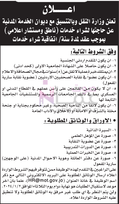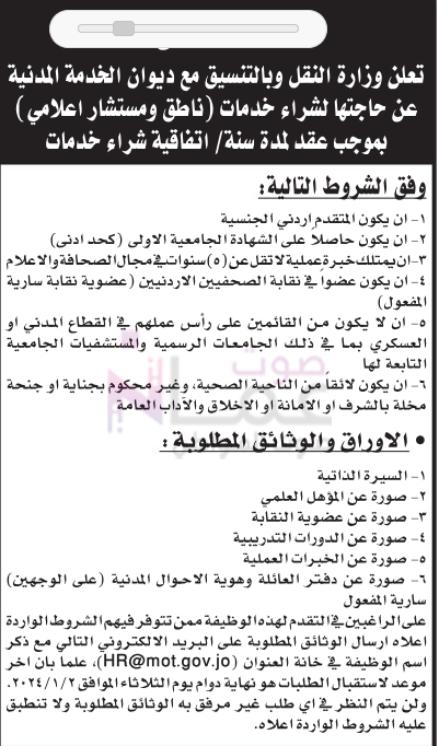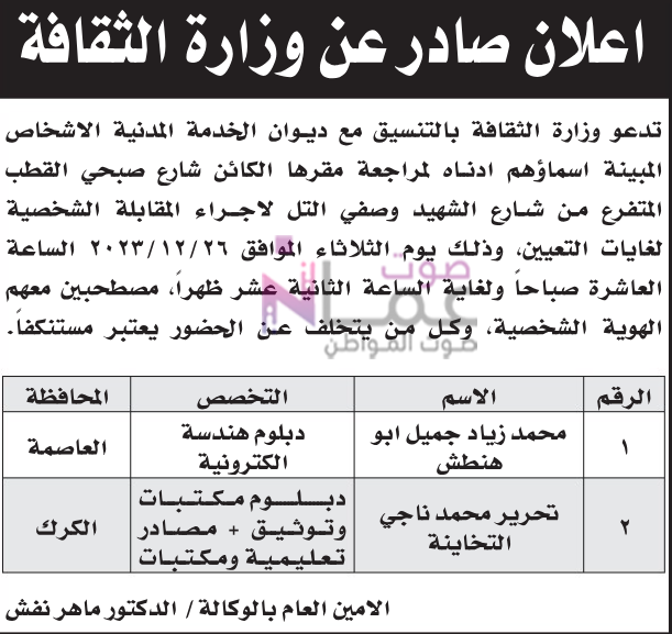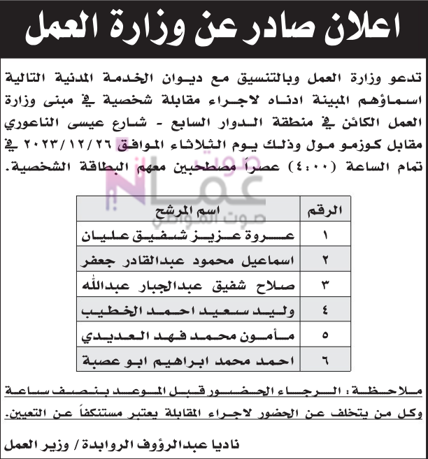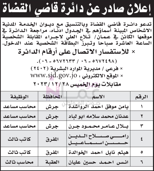 دعا ديوان الخدمة المدنية أشخاص لاستكمال إجراءات التعيين وإجراء المقابلات الشخصية بالتنسيق مع الدوائر المعنية وفقًا للشروط المحددة.