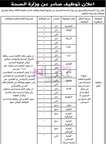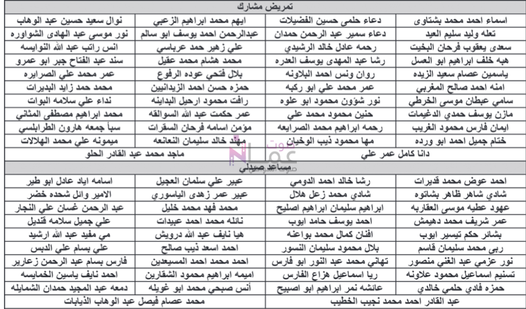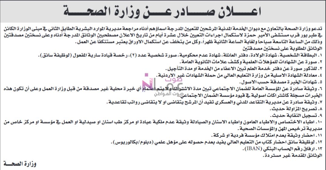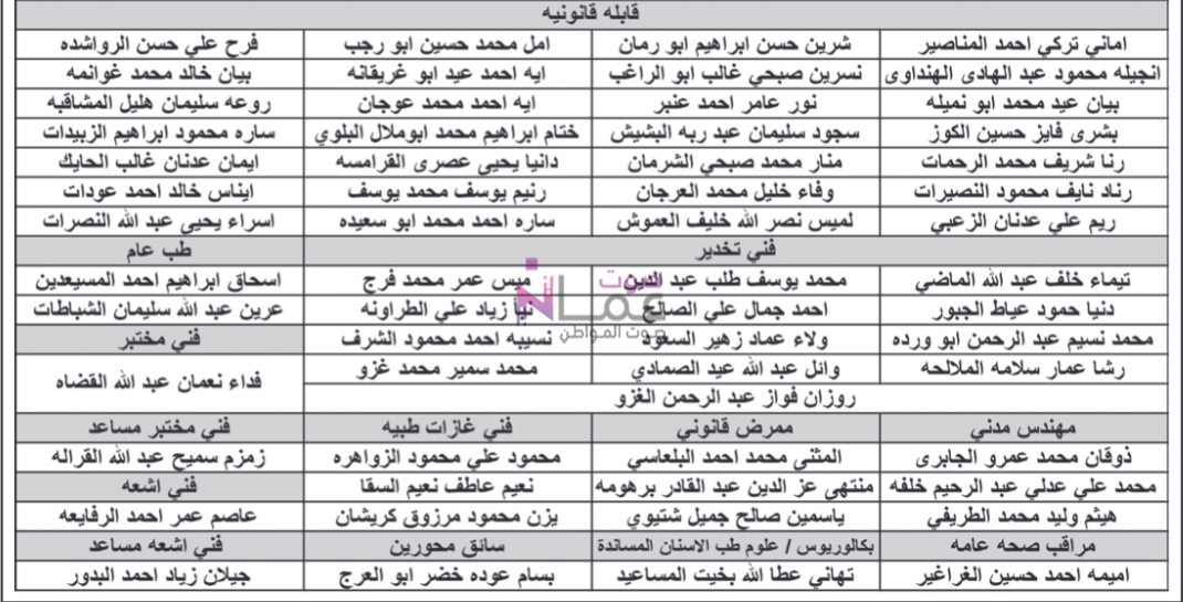 دعت وزارة الصحة، بالتعاون مع ديوان الخدمة المدنية، اليوم الأحد، التالية أسماؤهم لاستكمال اجراءات التعيين خلال عشرة أيام من تاريخ الاعلان.
