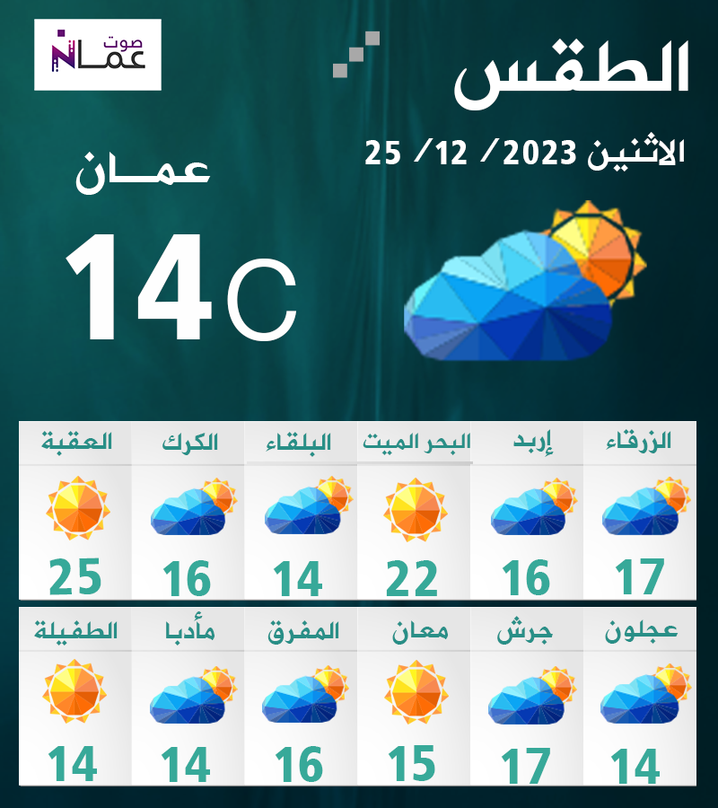 يوم الأربعاء، تبقى الأجواء باردة نسبياً في أغلب مناطق الأردن، ومائلة للدفء في الأغوار والبحر الميت والعقبة، مع ظهور كميات من الغيوم على ارتفاعات مختلفة، وهناك فرصة لهطول زخات متفرقة من المطر في أجزاء من المناطق الشرقية والجنوبية الشرقية من المملكة، والرياح جنوبية شرقية معتدلة السرعة تنشط على فترات وتكون مثيرة للغبار خاصة في مناطق البادية.
