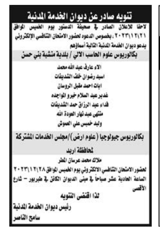 دعت عدد من الوزارات والمؤسسات الرسمية والبلديات بالتنسيق مع ديوان الخدمة المدنية، مرشحين لإجراء المقابلات الشخصية .