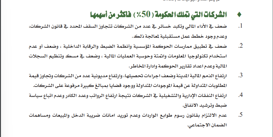 وبين أن هناك ارتفاع بالذمم المالية المدينة وضعف إجراءات تحصيلها وارتفاع مديونية عدد من الشركات وتجاوز قيمة المطلوبات المتداولة عن قيمة الموجودات المتداولة ووجود قضايا بمبالغ كبيرة مرفوعة على الشركات، بالإضافة إلى ارتفاع النفقات الإدارية والتشغيلية في الشركات نتيجة الرواتب وعدد الكادر وعدم اتباع سياسة ضبط وترشيد الانفاق.