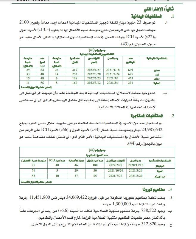 كشف تقرير ديوان المحاسبة لعام 2022، أنه تم صرف 23 مليون دينار تكلفة تجهيز المستشفيات الميدانية (عمان،اربد،معان) وتعيين 2100 موظف للعمل بها على الرغم من تدني متوسط نسبة الاشغال لها لما يقارب (13.5%) لاسرة العزل و(22) لاسرة العناية المشددة وتقف العمل في المستشفيات دون استغلالها بالشكل الامثل.